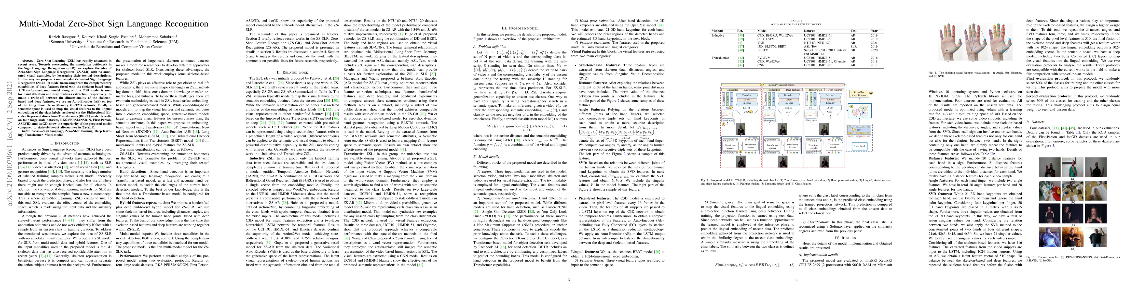This paper proposes a multi-modal Zero-Shot Sign Language Recognition model that leverages textual descriptions without requiring annotated visual examples. It uses a combination of deep features, skeleton-based features, and a Transformer-based model to achieve superior performance compared to state-of-the-art alternatives on four large-scale datasets.