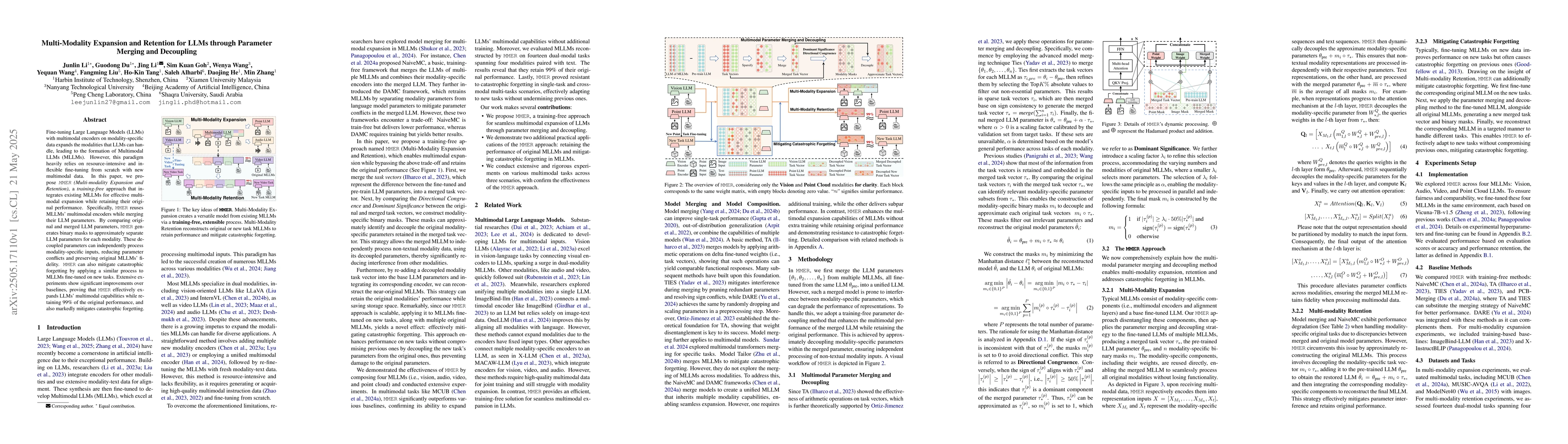 The introduction of MMER, a training-free method for multimodal expansion of LLMs by parameter merging and decoupling, which maintains original performance and mitigates forgetting.