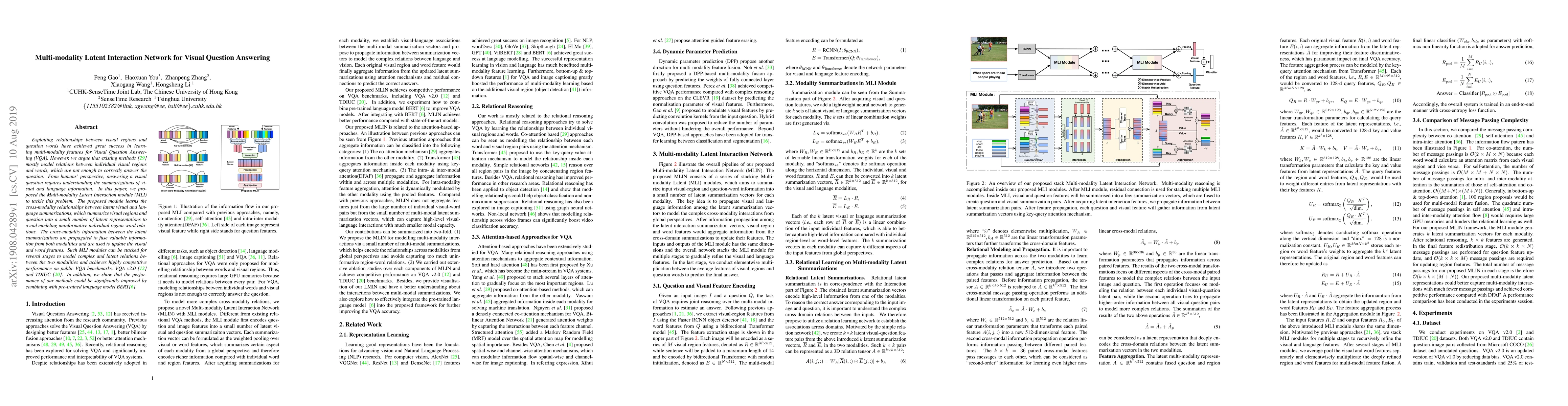 This paper proposes a Multi-modality Latent Interaction module (MLI) to enhance Visual Question Answering (VQA) by modeling relationships between latent summarizations of visual and language information, rather than individual region-word relations. The MLI module fuses cross-modality information to update visual and word features, achieving competitive performance on VQA v2.0 and TDIUC benchmarks, and further improves with BERT integration.