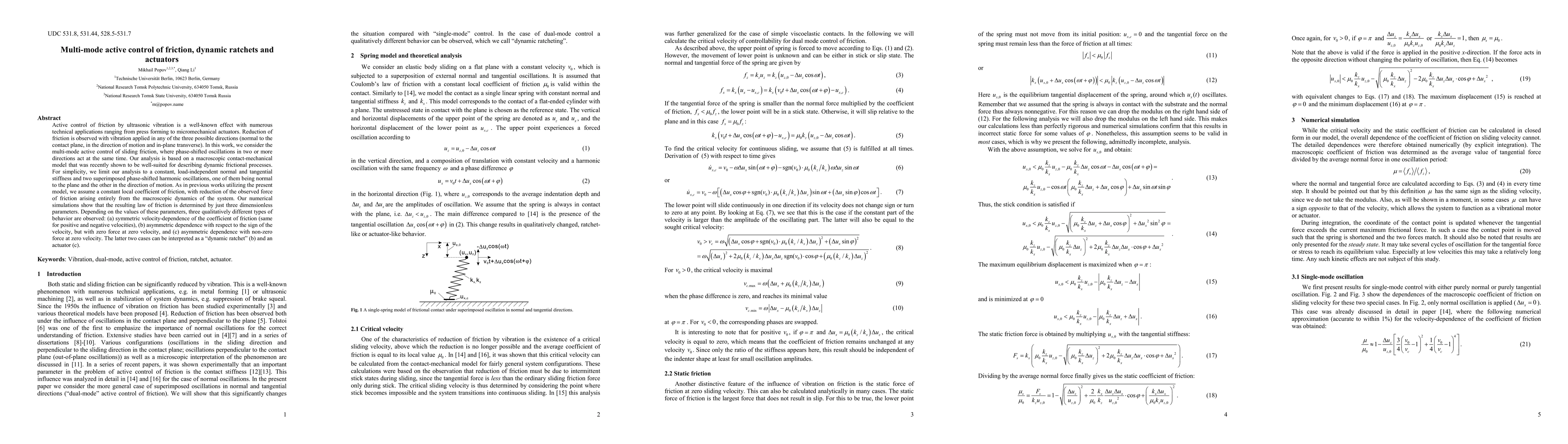 This research explores multi-mode active control of friction using ultrasonic vibrations, revealing that three dimensionless parameters govern friction behavior. Depending on these parameters, three distinct friction types are observed: symmetric, asymmetric with zero force at zero velocity, and asymmetric with non-zero force at zero velocity, interpreted as 'dynamic ratchet' and 'actuator' respectively.