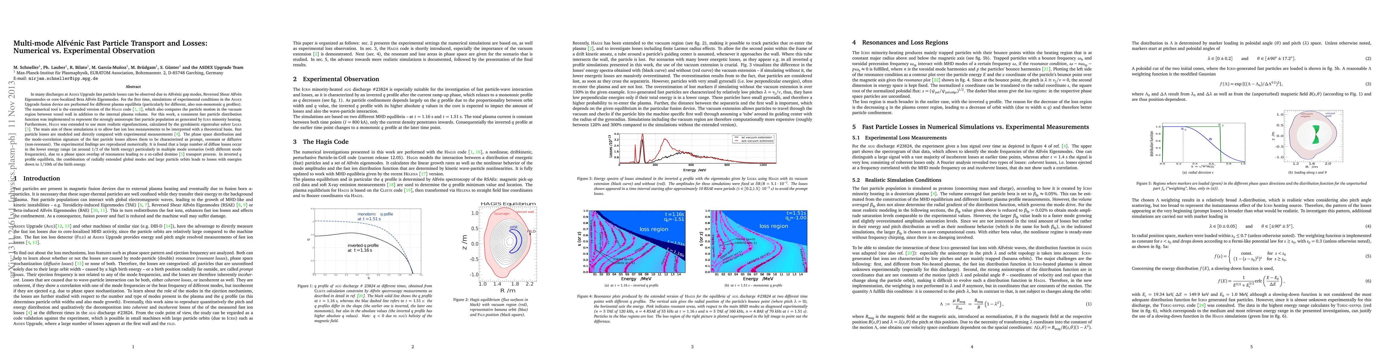 In many discharges at ASDEX Upgrade fast particle losses can be observed due to Alfv\'enic gap modes, Reversed Shear Alfv\'en Eigenmodes or core-localized Beta Alfv\'en Eigenmodes. For the first time, simulations of experimental conditions in the ASDEX Upgrade fusion device are performed for different plasma equilibria (particularly for different, also non-monotonic q profiles). The numerical tool is the extended version of the HAGIS code [Pinches'98, Br\"udgam PhD Thesis, 2010], which also computes the particle motion in the vacuum region between vessel wall in addition to the internal plasma volume. For this work, a consistent fast particle distribution function was implemented to represent the strongly anisotropic fast particle population as generated by ICRH minority heating. Furthermore, HAGIS was extended to use more realistic eigenfunctions, calculated by the gyrokinetic eigenvalue solver LIGKA [Lauber'07]. The main aim of these simulations is to allow fast ion loss measurements to be interpreted with a theoretical basis. Fast particle losses are modeled and directly compared with experimental measurements [Garc\'ia-Mu\~noz'10]. The phase space distribution and the mode-correlation signature of the fast particle losses allows them to be characterized as prompt, resonant or diffusive (non-resonant). The experimental findings are reproduced numerically. It is found that a large number of diffuse losses occur in the lower energy range (at around 1/3 of the birth energy) particularly in multiple mode scenarios (with different mode frequencies), due to a phase space overlap of resonances leading to a so-called domino [Berk'95] transport process. In inverted q profile equilibria, the combination of radially extended global modes and large particle orbits leads to losses with energies down to 1/10th of the birth energy.