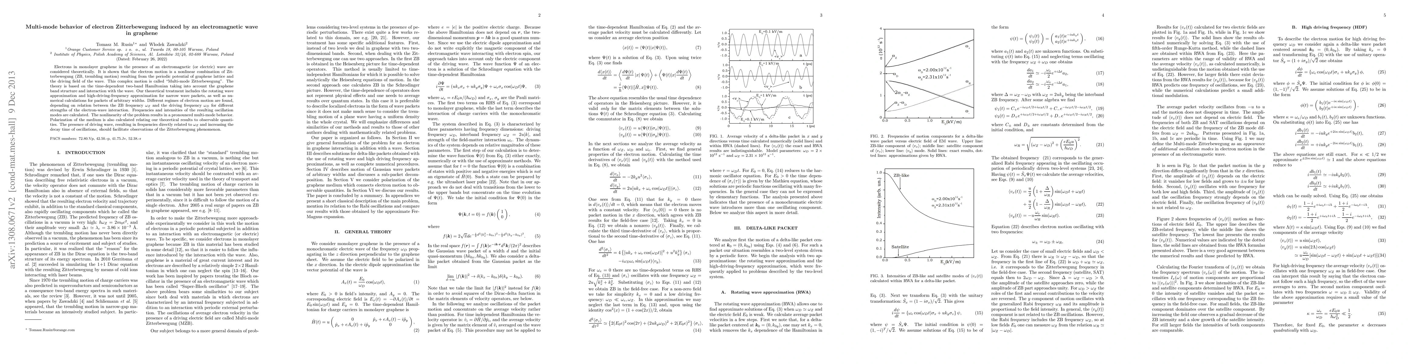 Electrons in monolayer graphene in the presence of an electromagnetic (or electric) wave are considered theoretically. It is shown that the electron motion is a nonlinear combination of Zitterbewegung (ZB, trembling motion) resulting from the periodic potential of graphene lattice and the driving field of the wave. This complex motion is called "Multi-mode Zitterbewegung". The theory is based on the time-dependent two-band Hamiltonian taking into account the graphene band structure and interaction with the wave. Our theoretical treatment includes the rotating wave approximation and high-driving-frequency approximation for narrow wave packets, as well as numerical calculations for packets of arbitrary widths. Different regimes of electron motion are found, depending on relation between the ZB frequency $\omega_Z$ and the driving frequency $\omega_D$ for different strengths of the electron-wave interaction. Frequencies and intensities of the resulting oscillation modes are calculated. The nonlinearity of the problem results in a pronounced multi-mode behavior. Polarization of the medium is also calculated relating our theoretical results to observable quantities. The presence of driving wave, resulting in frequencies directly related to $\omega_Z$ and increasing the decay time of oscillations, should facilitate observations of the Zitterbewegung phenomenon.
