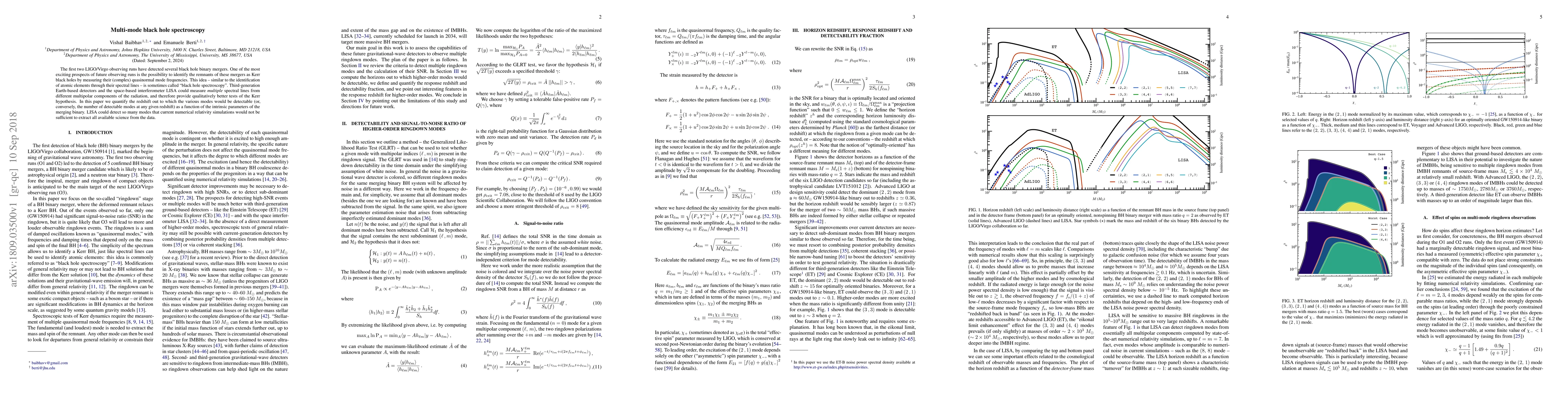 The first two LIGO/Virgo observing runs have detected several black hole binary mergers. One of the most exciting prospects of future observing runs is the possibility to identify the remnants of these mergers as Kerr black holes by measuring their (complex) quasinormal mode frequencies. This idea - similar to the identification of atomic elements through their spectral lines - is sometimes called "black hole spectroscopy". Third-generation Earth-based detectors and the space-based interferometer LISA could measure multiple spectral lines from different multipolar components of the radiation, and therefore provide qualitatively better tests of the Kerr hypothesis. In this paper we quantify the redshift out to which the various modes would be detectable (or, conversely, the number of detectable modes at any given redshift) as a function of the intrinsic parameters of the merging binary. LISA could detect so many modes that current numerical relativity simulations would not be sufficient to extract all available science from the data.