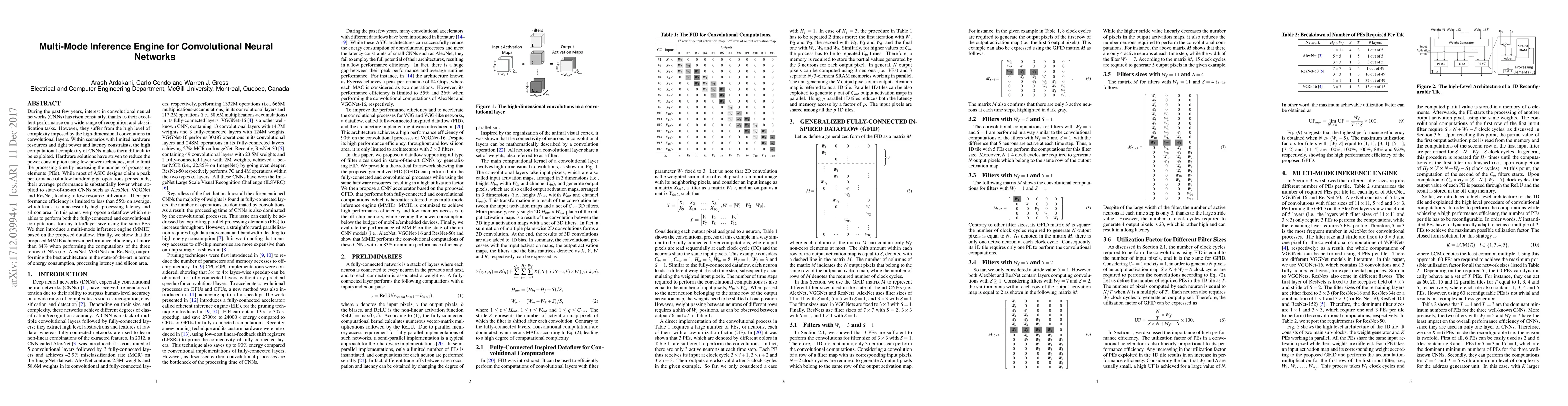 During the past few years, interest in convolutional neural networks (CNNs) has risen constantly, thanks to their excellent performance on a wide range of recognition and classification tasks. However, they suffer from the high level of complexity imposed by the high-dimensional convolutions in convolutional layers. Within scenarios with limited hardware resources and tight power and latency constraints, the high computational complexity of CNNs makes them difficult to be exploited. Hardware solutions have striven to reduce the power consumption using low-power techniques, and to limit the processing time by increasing the number of processing elements (PEs). While most of ASIC designs claim a peak performance of a few hundred giga operations per seconds, their average performance is substantially lower when applied to state-of-the-art CNNs such as AlexNet, VGGNet and ResNet, leading to low resource utilization. Their performance efficiency is limited to less than 55% on average, which leads to unnecessarily high processing latency and silicon area. In this paper, we propose a dataflow which enables to perform both the fully-connected and convolutional computations for any filter/layer size using the same PEs. We then introduce a multi-mode inference engine (MMIE) based on the proposed dataflow. Finally, we show that the proposed MMIE achieves a performance efficiency of more than 84% when performing the computations of the three renown CNNs (i.e., AlexNet, VGGNet and ResNet), outperforming the best architecture in the state-of-the-art in terms of energy consumption, processing latency and silicon area.