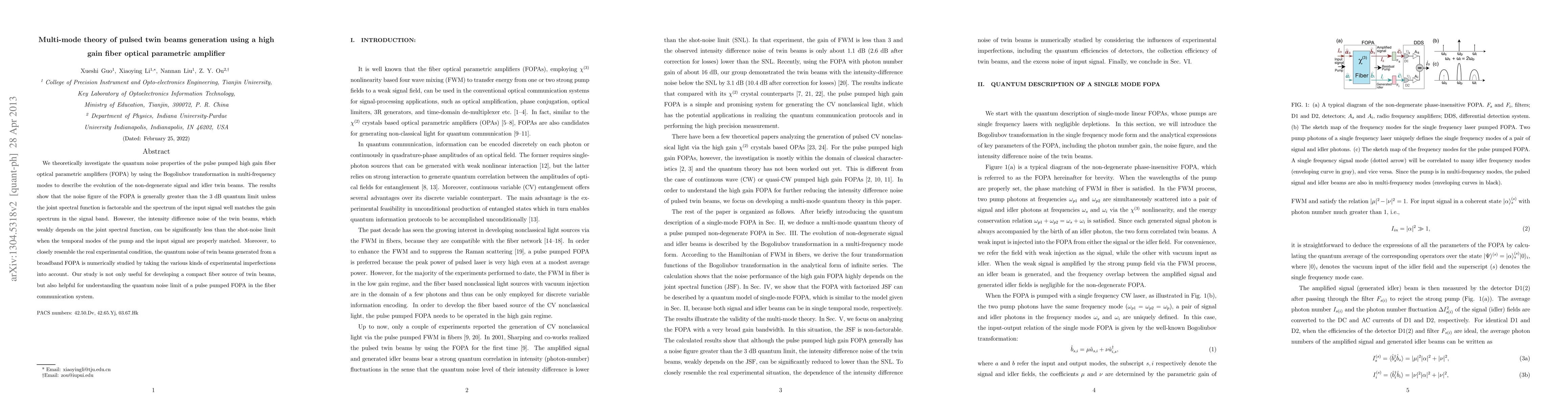 This paper investigates the quantum noise properties of pulse-pumped high gain fiber optical parametric amplifiers (FOPA) using multi-frequency modes and Bogoliubov transformation. It reveals that while the noise figure generally exceeds the 3 dB quantum limit, proper matching of temporal modes can reduce intensity difference noise below the shot-noise limit, aiding in the development of compact twin beam sources and understanding quantum noise limits in fiber communication systems.