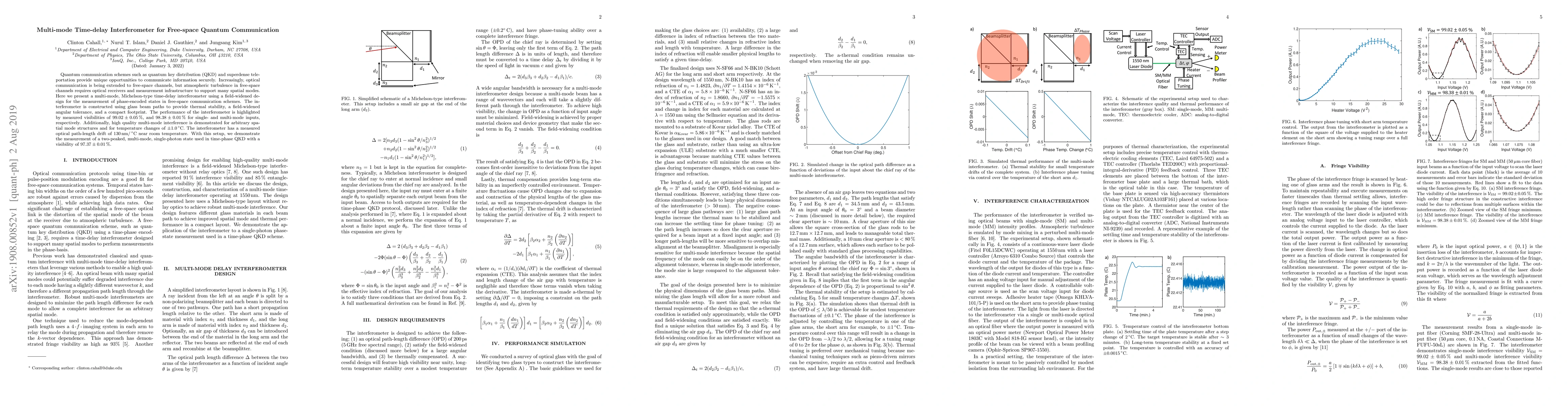 This paper presents a multi-mode time-delay interferometer designed for free-space quantum communication, achieving high visibilities and stability under atmospheric turbulence. The interferometer supports phase-encoded states and demonstrates high-quality multi-mode interference, crucial for secure quantum key distribution.