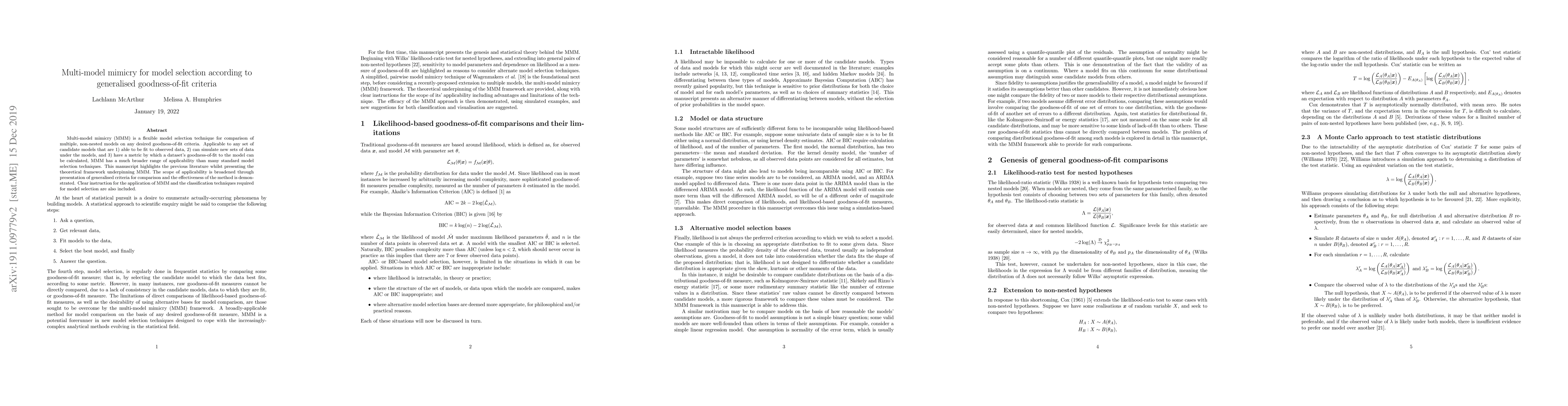 This paper introduces multi-model mimicry (MMM) as a versatile model selection technique that evaluates multiple, non-nested models based on generalised goodness-of-fit criteria, offering broader applicability than traditional methods. It provides a theoretical framework, generalised criteria for comparison, and practical instructions for its application.
