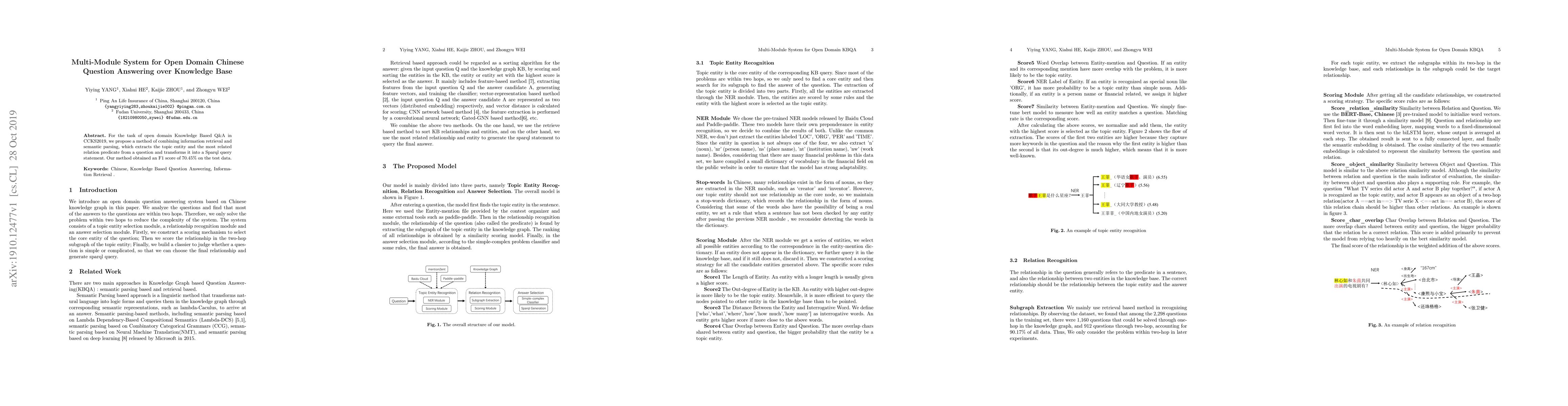 This paper proposes a multi-module system for open domain Chinese question answering that combines information retrieval and semantic parsing to transform questions into Sparql queries, achieving a test F1 score of 70.45%. The system extracts key entities and relations from questions to enhance query accuracy.