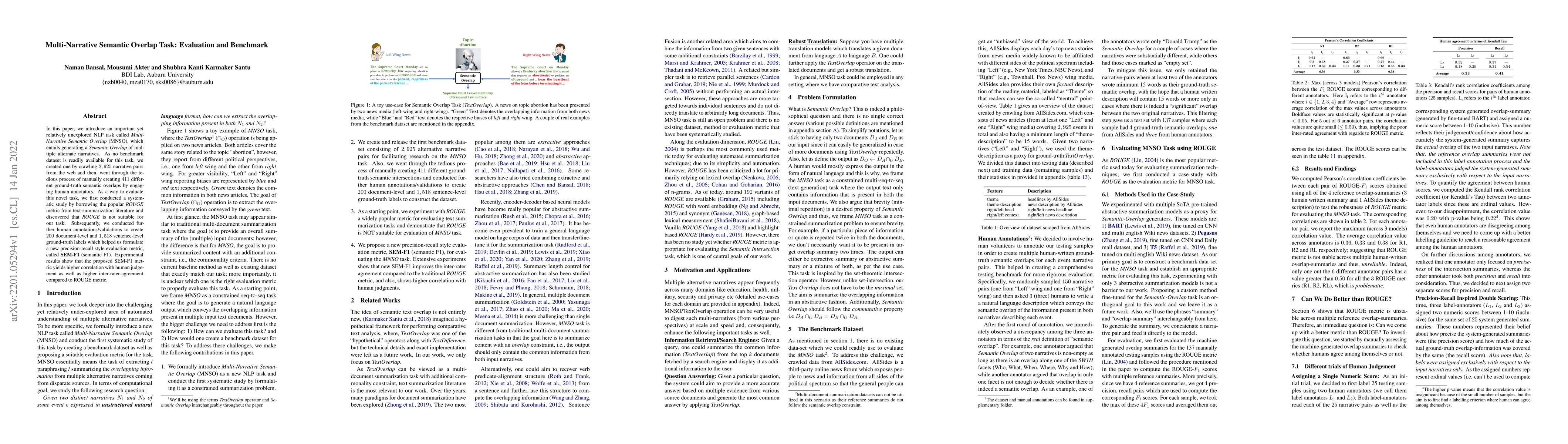 This paper introduces a new NLP task, Multi-Narrative Semantic Overlap, and develops a benchmark dataset for it. It finds that the ROUGE metric is unsuitable for evaluating the task and proposes a new SEM-F1 metric, which correlates better with human judgments and shows higher inter-rater agreement.