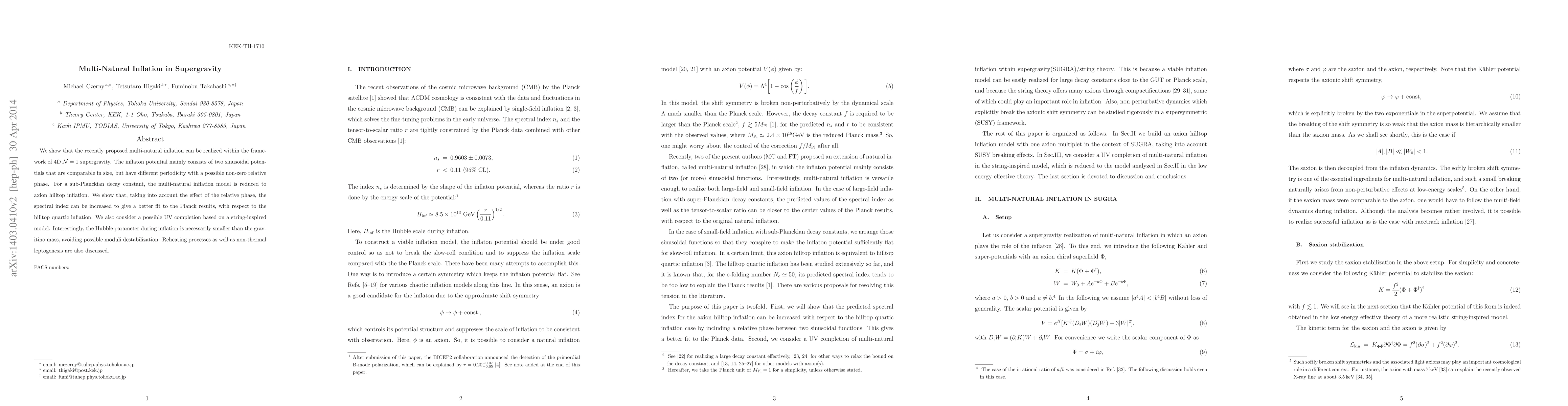This paper demonstrates that multi-natural inflation can be embedded in 4D ${\cal N}=1$ supergravity, featuring a potential composed of two comparable sinusoidal potentials with different periodicities and a non-zero relative phase. It shows that the model can better fit Planck results by adjusting the spectral index, and discusses a string-inspired UV completion while ensuring the Hubble parameter remains below the gravitino mass.