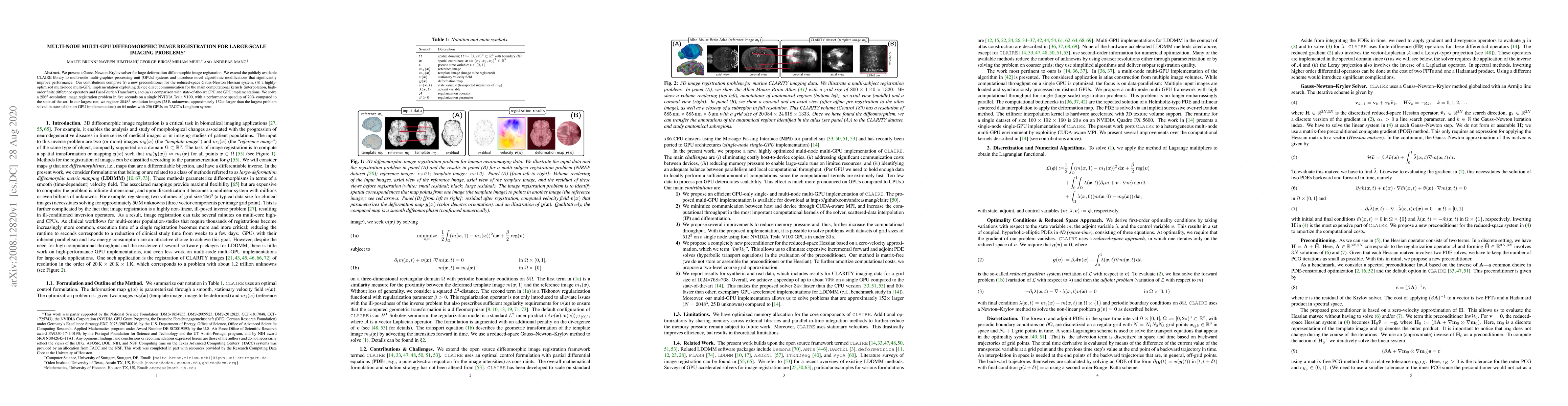 This paper introduces a Gauss-Newton-Krylov solver for large deformation diffeomorphic image registration, extending the CLAIRE library to multi-node multi-GPU systems. The authors achieve a 70% performance speedup by optimizing computational kernels and implementing a new preconditioner.
