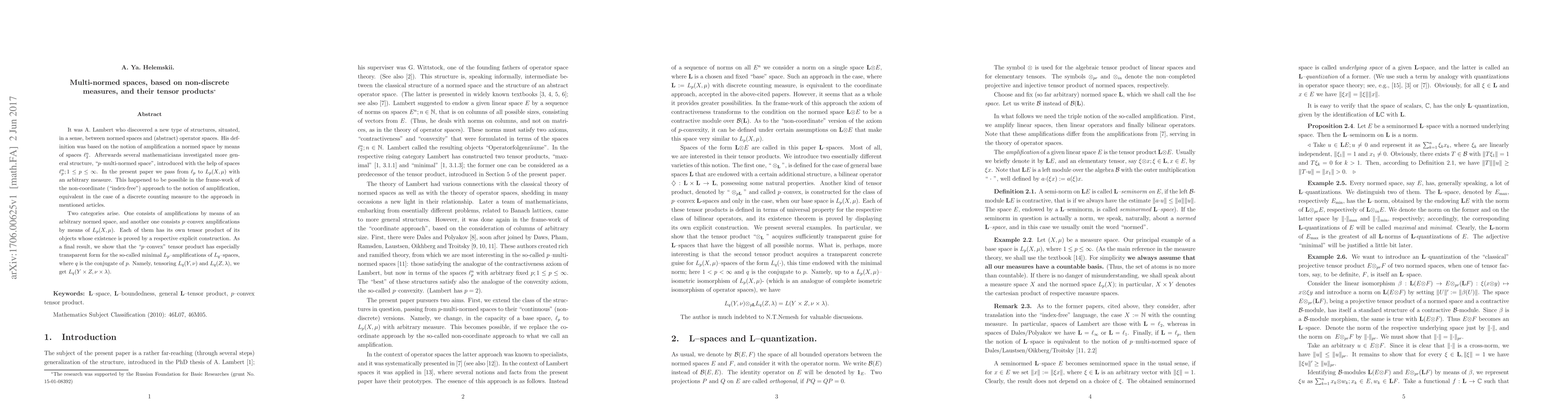 It was A. Lambert who discovered a new type of structures, situated, in a sense, between normed spaces and (abstract) operator spaces. His definition was based on the notion of amplification a normed space by means of spaces $\ell_2^n$. Afterwards several mathematicians investigated more general structure, "p-multi-normed space", introduced with the help of spaces $\ell_p^n$; $1\le p\le\infty$. In the present paper we pass from $\ell_p$ to $L_p(X,\mu)$ with an arbitrary measure. This happened to be possible in the frame-work of the non-coordinate ("index-free") approach to the notion of amplification, equivalent in the case of a discrete counting measure to the approach in mentioned articles. Two categories arise. One consists of amplifications by means of an arbitrary normed space, and another one consists of p-convex amplifications by means of $L_p(X,\mu)$. Each of them has its own tensor product of its objects whose existence is proved by a respective explicit construction. As a final result, we show that the "p-convex" tensor product has especially transparent form for the so-called minimal $L_p$-amplifications of $L_q$-spaces, where q is the conjugate of p. Namely, tensoring $L_q(Y,\nu)$ and $L_q(Z,\lambda)$, we get $L_q(Y\times Z,\nu\times\lambda)$.