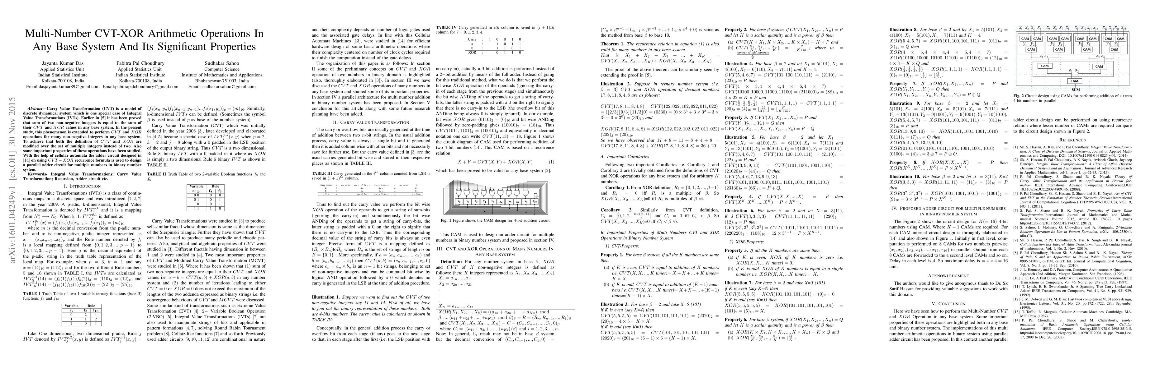 Carry Value Transformation (CVT) is a model of discrete dynamical system which is one special case of Integral Value Transformations (IVTs). Earlier in [5] it has been proved that sum of two non-negative integers is equal to the sum of their CVT and XOR values in any base system. In the present study, this phenomenon is extended to perform CVT and XOR operations for many non-negative integers in any base system. To achieve that both the definition of CVT and XOR are modified over the set of multiple integers instead of two. Also some important properties of these operations have been studied. With the help of cellular automata the adder circuit designed in [14] on using CVT-XOR recurrence formula is used to design a parallel adder circuit for multiple numbers in binary number system.