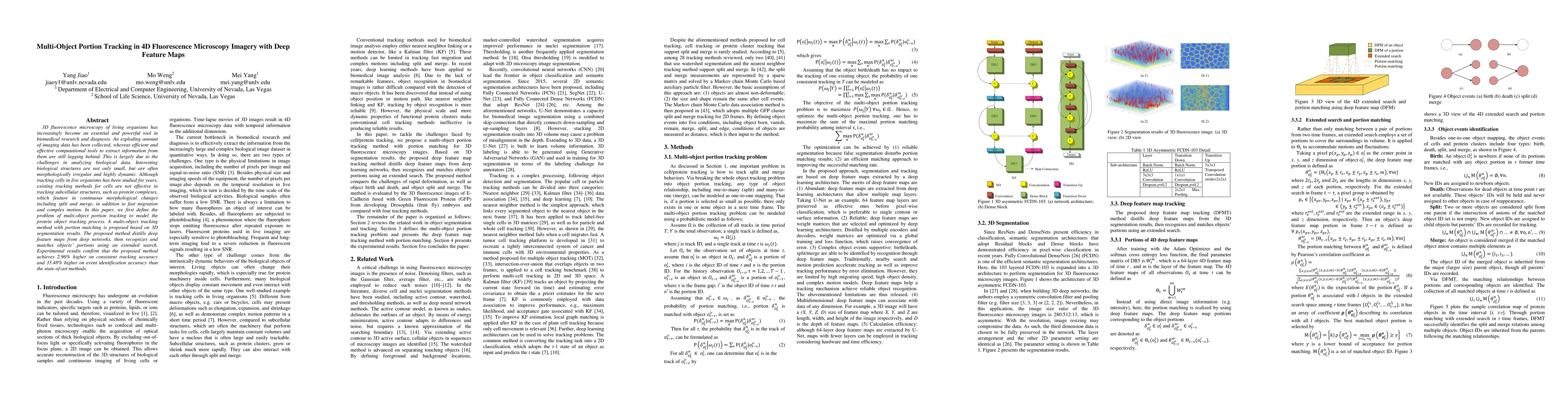 3D fluorescence microscopy of living organisms has increasingly become an essential and powerful tool in biomedical research and diagnosis. An exploding amount of imaging data has been collected, whereas efficient and effective computational tools to extract information from them are still lagging behind. This is largely due to the challenges in analyzing biological data. Interesting biological structures are not only small, but are often morphologically irregular and highly dynamic. Although tracking cells in live organisms has been studied for years, existing tracking methods for cells are not effective in tracking subcellular structures, such as protein complexes, which feature in continuous morphological changes including split and merge, in addition to fast migration and complex motion. In this paper, we first define the problem of multi-object portion tracking to model the protein object tracking process. A multi-object tracking method with portion matching is proposed based on 3D segmentation results. The proposed method distills deep feature maps from deep networks, then recognizes and matches object portions using an extended search. Experimental results confirm that the proposed method achieves 2.96% higher on consistent tracking accuracy and 35.48% higher on event identification accuracy than the state-of-art methods.