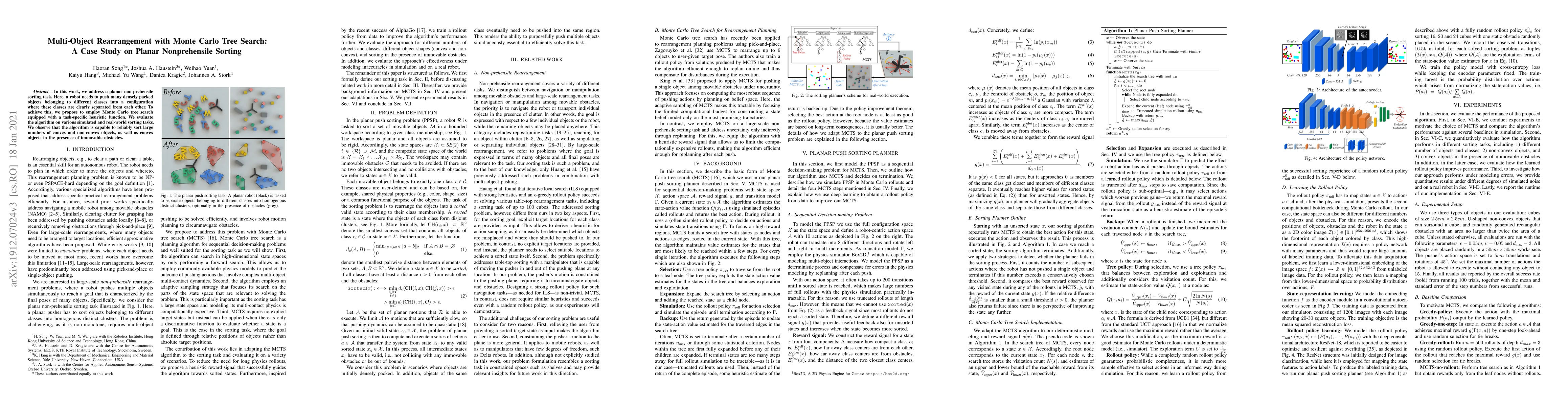 In this work, we address a planar non-prehensile sorting task. Here, a robot needs to push many densely packed objects belonging to different classes into a configuration where these classes are clearly separated from each other. To achieve this, we propose to employ Monte Carlo tree search equipped with a task-specific heuristic function. We evaluate the algorithm on various simulated and real-world sorting tasks. We observe that the algorithm is capable to reliably sort large numbers of convex and non-convex objects, as well as convex objects in the presence of immovable obstacles.