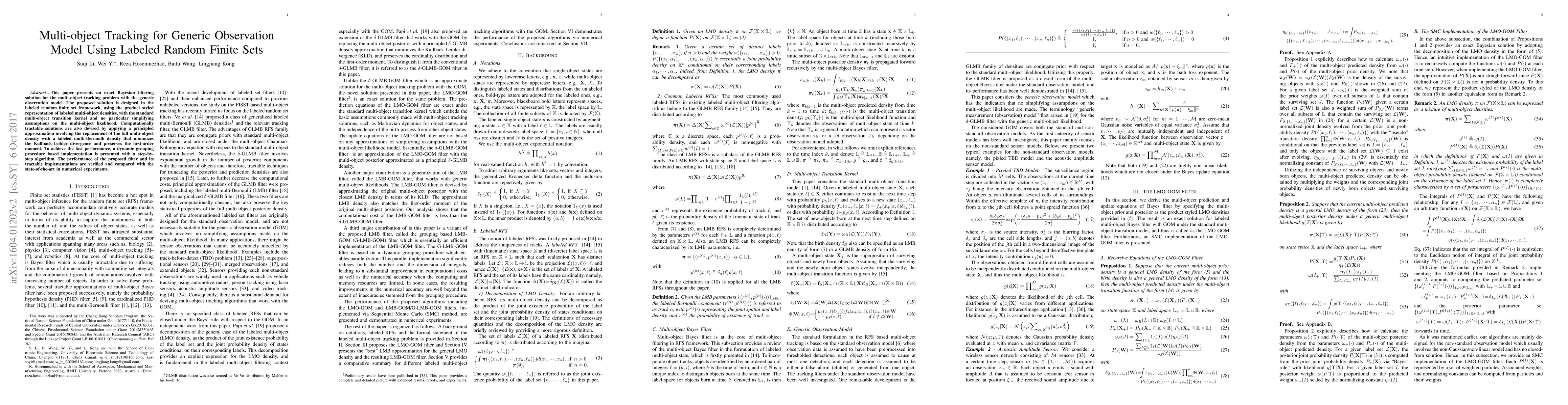 This paper presents an exact Bayesian filtering solution for the multi-object tracking problem with the generic observation model. The proposed solution is designed in the labeled random finite set framework, using the product styled representation of labeled multi-object densities, with the standard multi-object transition kernel and no particular simplifying assumptions on the multi-object likelihood. Computationally tractable solutions are also devised by applying a principled approximation involving the replacement of the full multi-object density with a labeled multi-Bernoulli density that minimizes the Kullback-Leibler divergence and preserves the first-order moment. To achieve the fast performance, a dynamic grouping procedure based implementation is presented with a step-by-step algorithm. The performance of the proposed filter and its tractable implementations are verified and compared with the state-of-the-art in numerical experiments.