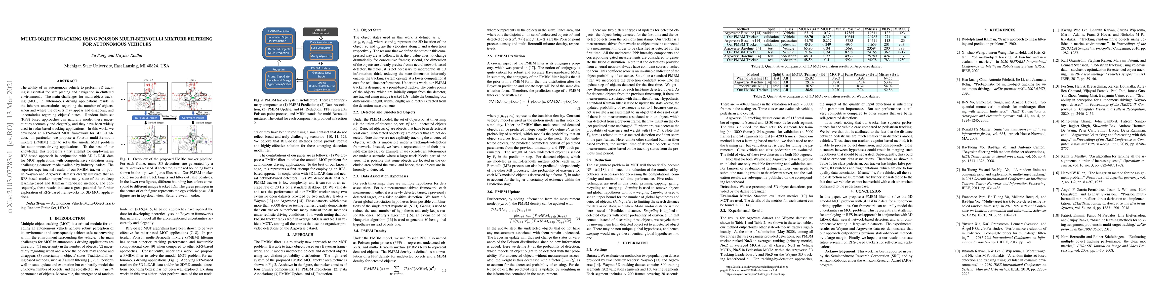 This paper presents an RFS-based Poisson multi-Bernoulli mixture (PMBM) filter for multi-object tracking (MOT) in autonomous vehicles using 3D LiDAR data, demonstrating superior performance over state-of-the-art methods on public datasets. The proposed approach effectively addresses uncertainties in object appearance and disappearance, showcasing potential for future RFS-based MOT applications.