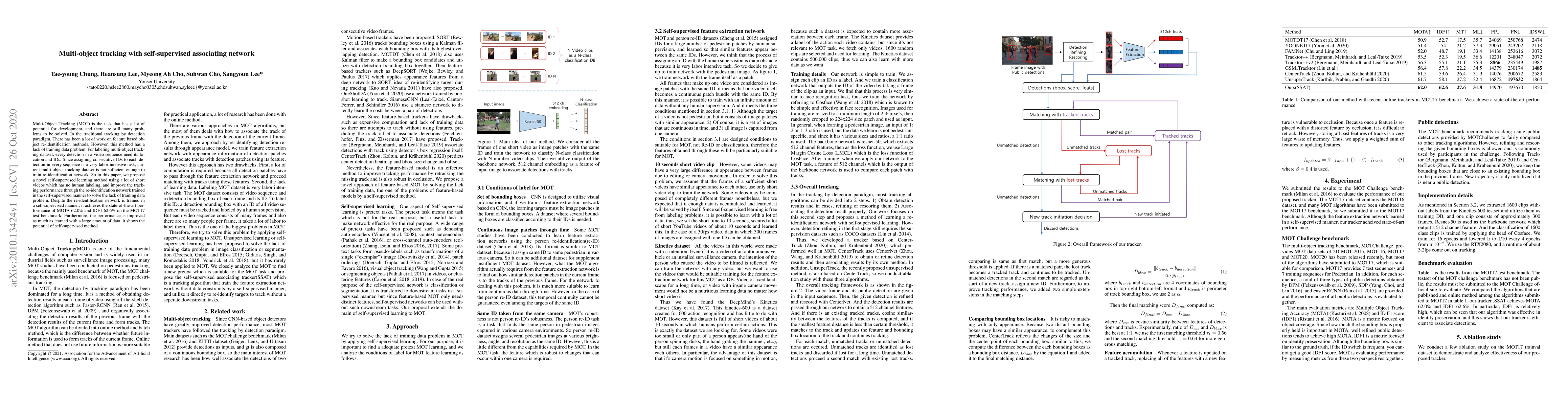 The paper introduces a self-supervised associating network for MOT, enabling the training of re-identification networks using unlabeled short video clips, which outperforms existing methods on the MOT17 benchmark.