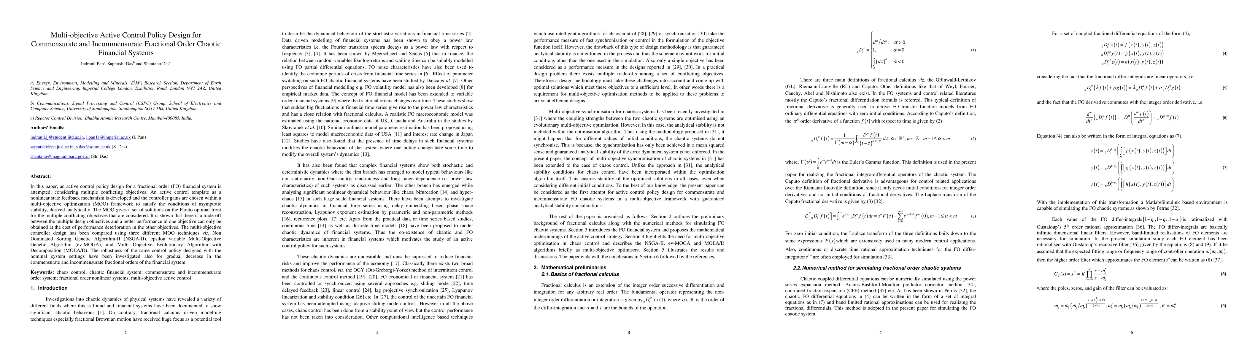 This paper develops an active control policy for fractional order chaotic financial systems, addressing multiple conflicting objectives using a nonlinear state feedback mechanism within a multi-objective optimization framework. The study compares three MOO techniques and evaluates the robustness of the control policy under changes in fractional order parameters.
