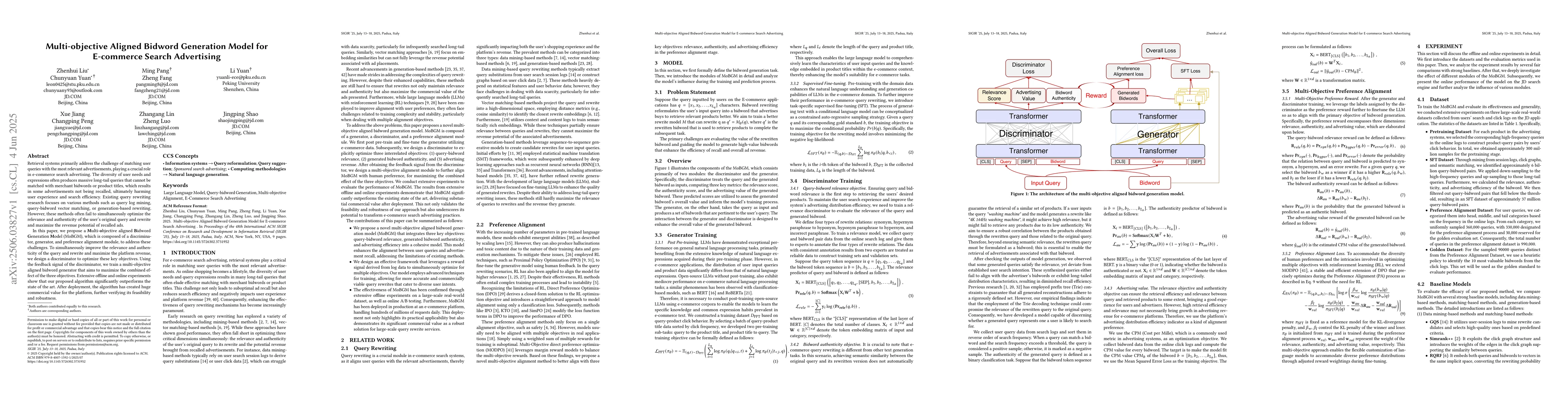 Retrieval systems primarily address the challenge of matching user queries with the most relevant advertisements, playing a crucial role in e-commerce search advertising. The diversity of user needs and expressions often produces massive long-tail queries that cannot be matched with merchant bidwords or product titles, which results in some advertisements not being recalled, ultimately harming user experience and search efficiency. Existing query rewriting research focuses on various methods such as query log mining, query-bidword vector matching, or generation-based rewriting. However, these methods often fail to simultaneously optimize the relevance and authenticity of the user's original query and rewrite and maximize the revenue potential of recalled ads. In this paper, we propose a Multi-objective aligned Bidword Generation Model (MoBGM), which is composed of a discriminator, generator, and preference alignment module, to address these challenges. To simultaneously improve the relevance and authenticity of the query and rewrite and maximize the platform revenue, we design a discriminator to optimize these key objectives. Using the feedback signal of the discriminator, we train a multi-objective aligned bidword generator that aims to maximize the combined effect of the three objectives. Extensive offline and online experiments show that our proposed algorithm significantly outperforms the state of the art. After deployment, the algorithm has created huge commercial value for the platform, further verifying its feasibility and robustness.
