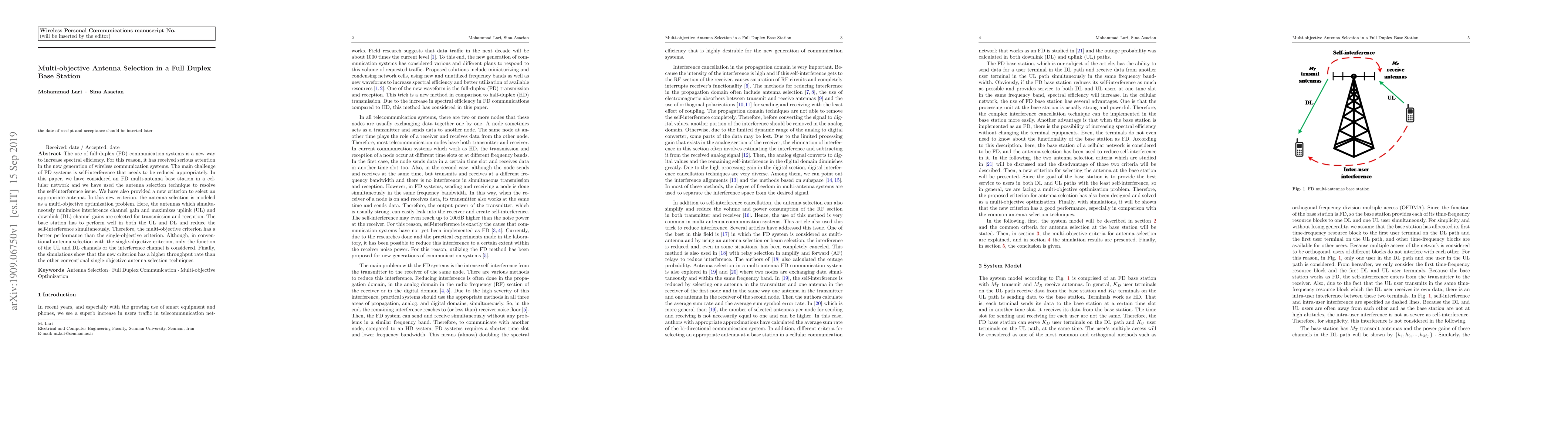 This paper proposes a multi-objective antenna selection technique for full-duplex base stations to enhance spectral efficiency by minimizing self-interference and maximizing uplink and downlink channel gains. The new criterion outperforms conventional single-objective methods, resulting in higher throughput rates as demonstrated by simulations.