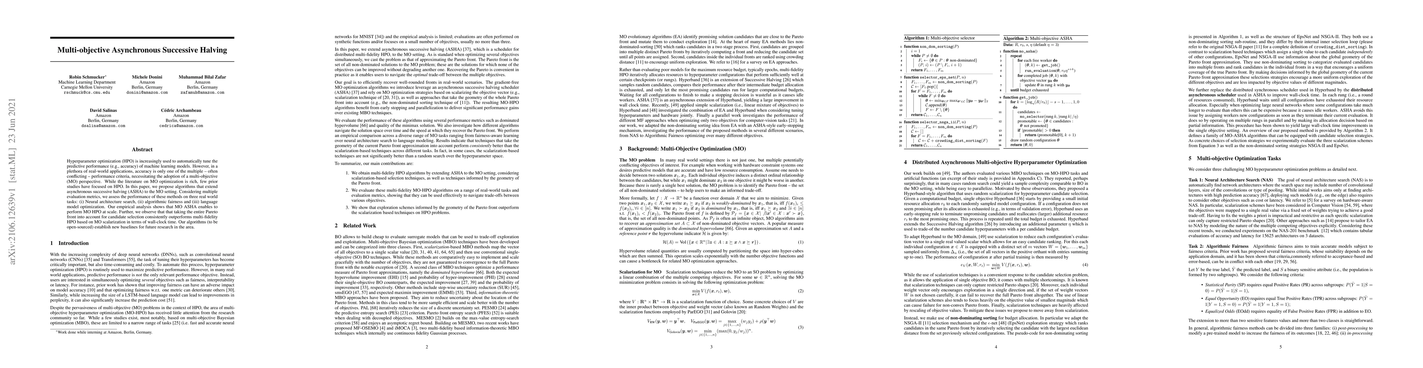 This paper proposes multi-objective asynchronous successive halving (MO ASHA) algorithms for hyperparameter optimization, addressing the challenge of optimizing multiple conflicting performance criteria. The proposed methods are evaluated on three real-world tasks, demonstrating their effectiveness and scalability in multi-objective hyperparameter optimization.