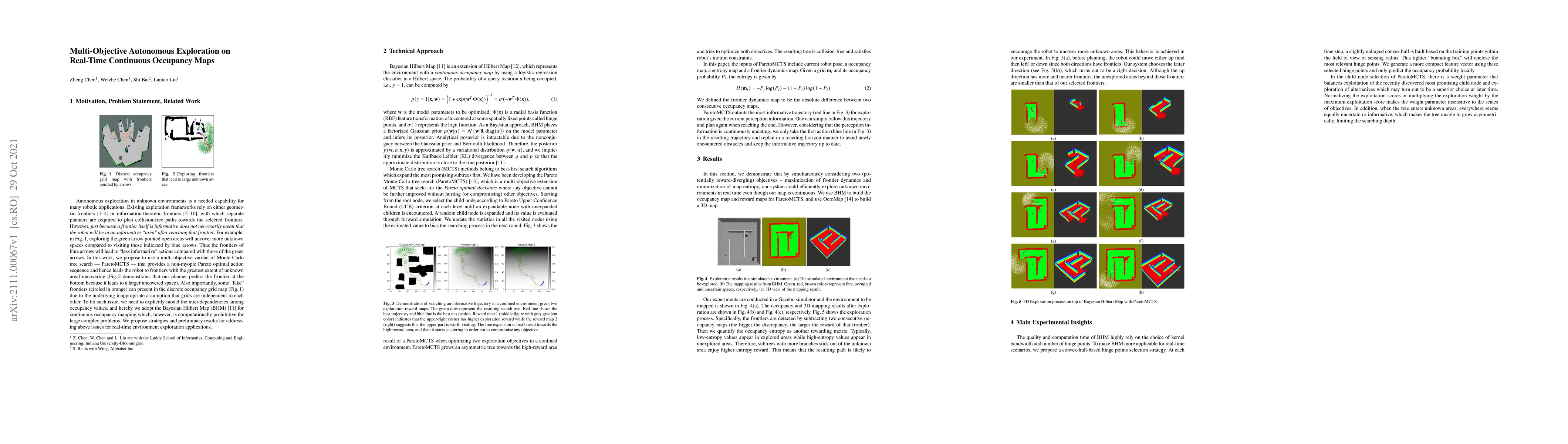 Autonomous exploration in unknown environments using mobile robots is the pillar of many robotic applications. Existing exploration frameworks either select the nearest geometric frontier or the nearest information-theoretic frontier. However, just because a frontier itself is informative does not necessarily mean that the robot will be in an informative area after reaching that frontier. To fill this gap, we propose to use a multi-objective variant of Monte-Carlo tree search that provides a non-myopic Pareto optimal action sequence leading the robot to a frontier with the greatest extent of unknown area uncovering. We also adopted Bayesian Hilbert Map (BHM) for continuous occupancy mapping and made it more applicable to real-time tasks.