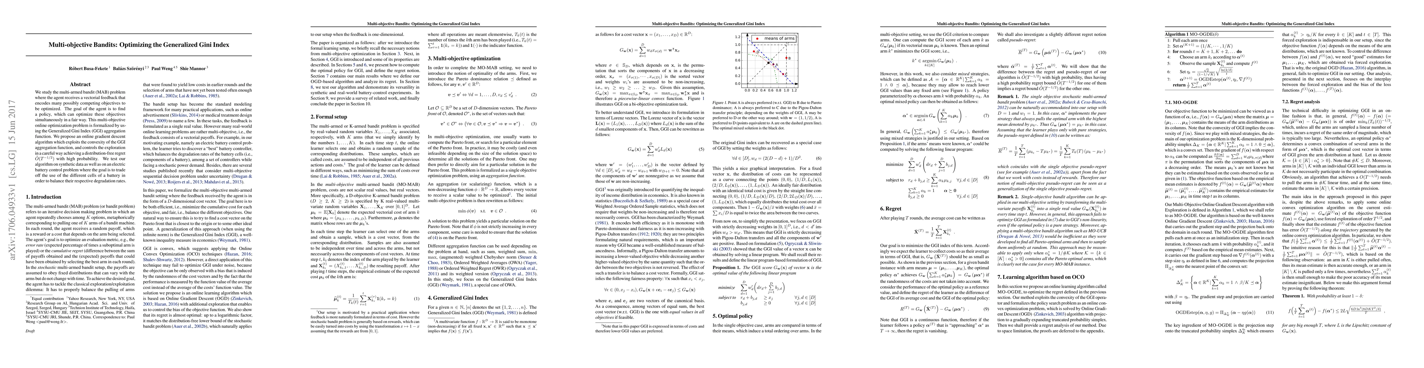 This paper proposes an algorithm for optimizing multiple competing objectives in a multi-objective online optimization problem using the Generalized Gini Index aggregation function, achieving near-optimal regret with high probability.
