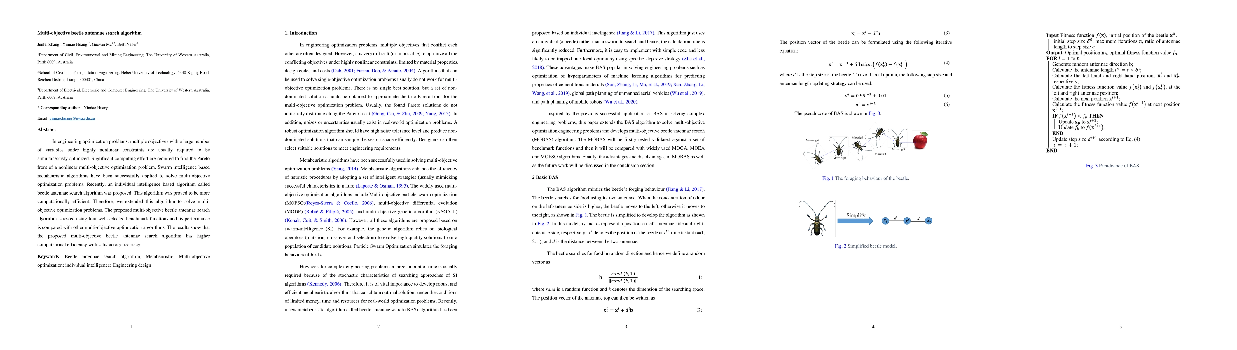 The paper proposes a multi-objective beetle antennae search algorithm to efficiently solve complex optimization problems with multiple objectives and nonlinear constraints. The algorithm's performance is tested against benchmark functions, demonstrating higher computational efficiency and satisfactory accuracy compared to other multi-objective optimization methods.