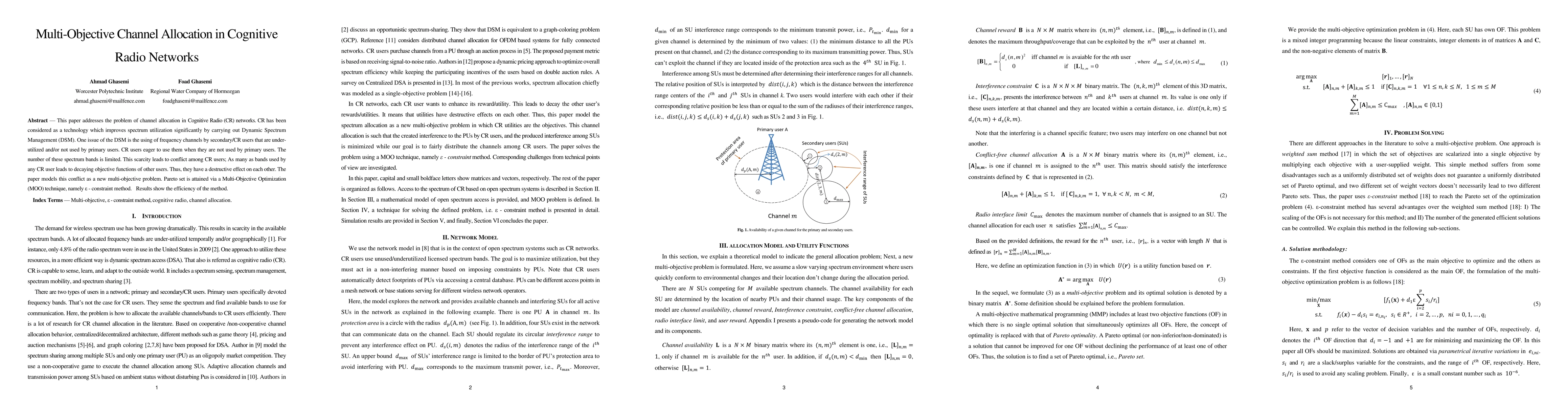This paper tackles the multi-objective channel allocation problem in Cognitive Radio networks, modeling it as a conflict among secondary users competing for limited under-utilized spectrum bands. It employs the {\epsilon}-constraint method for Multi-Objective Optimization to achieve an efficient Pareto set.