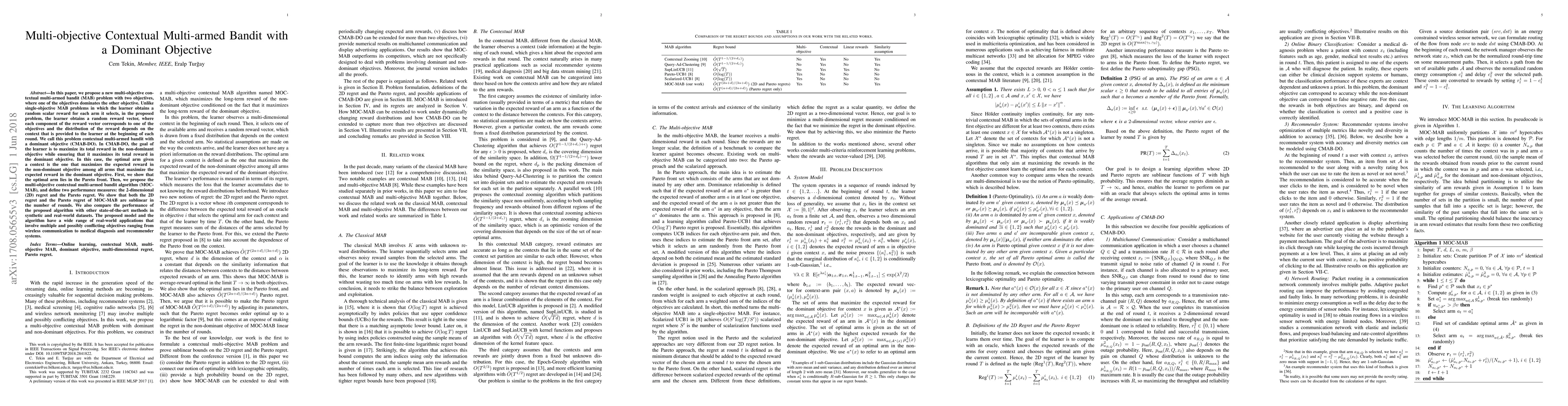 This paper introduces a multi-objective contextual multi-armed bandit problem (CMAB-DO) with a dominant objective, where the learner maximizes rewards in both objectives but prioritizes the dominant one. The proposed MOC-MAB algorithm achieves sublinear regret and is compared against other methods, demonstrating its effectiveness in various real-world applications.