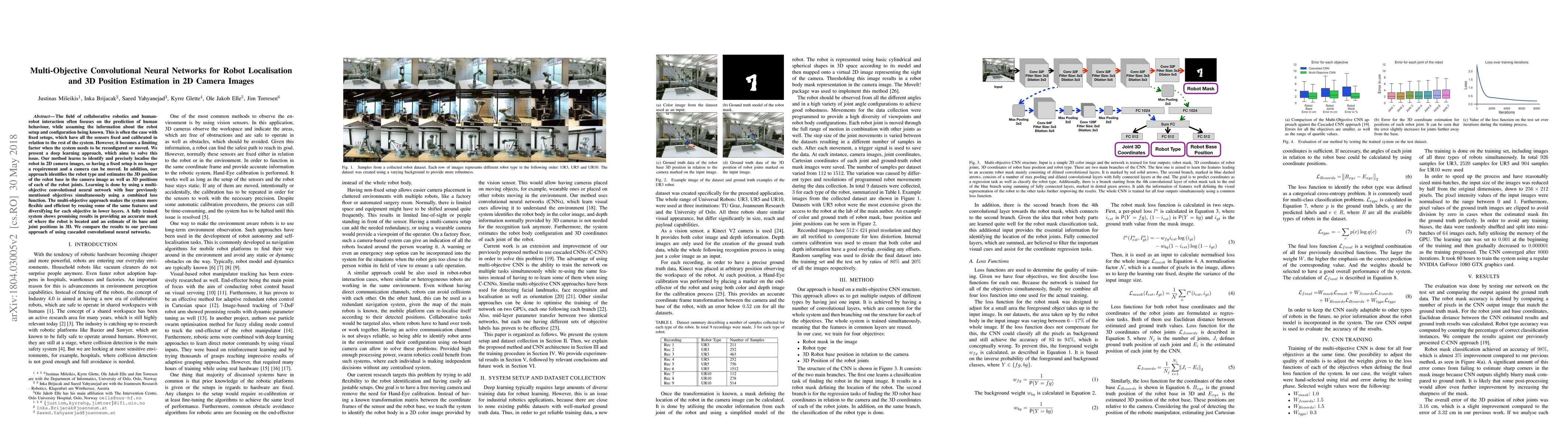 The field of collaborative robotics and human-robot interaction often focuses on the prediction of human behaviour, while assuming the information about the robot setup and configuration being known. This is often the case with fixed setups, which have all the sensors fixed and calibrated in relation to the rest of the system. However, it becomes a limiting factor when the system needs to be reconfigured or moved. We present a deep learning approach, which aims to solve this issue. Our method learns to identify and precisely localise the robot in 2D camera images, so having a fixed setup is no longer a requirement and a camera can be moved. In addition, our approach identifies the robot type and estimates the 3D position of the robot base in the camera image as well as 3D positions of each of the robot joints. Learning is done by using a multi-objective convolutional neural network with four previously mentioned objectives simultaneously using a combined loss function. The multi-objective approach makes the system more flexible and efficient by reusing some of the same features and diversifying for each objective in lower layers. A fully trained system shows promising results in providing an accurate mask of where the robot is located and an estimate of its base and joint positions in 3D. We compare the results to our previous approach of using cascaded convolutional neural networks.