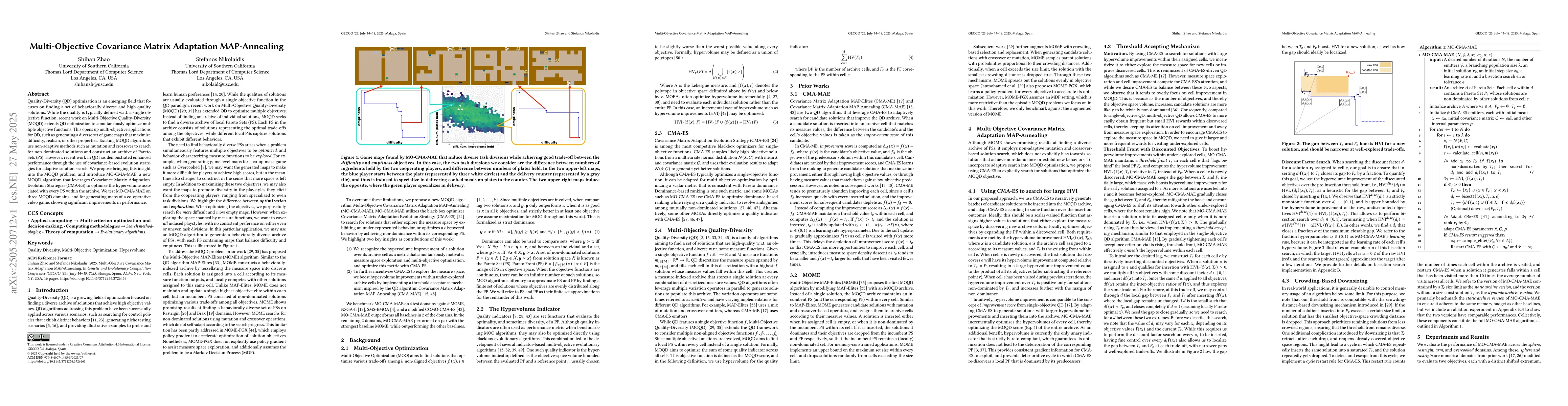 This paper introduces MO-CMA-MAE, a novel Multi-Objective Quality-Diversity (MOQD) algorithm that utilizes Covariance Matrix Adaptation-Evolution Strategies (CMA-ES) to enhance hypervolume optimization within Pareto Sets. Testing on various domains, including game map generation, demonstrates significant performance improvements over existing methods.