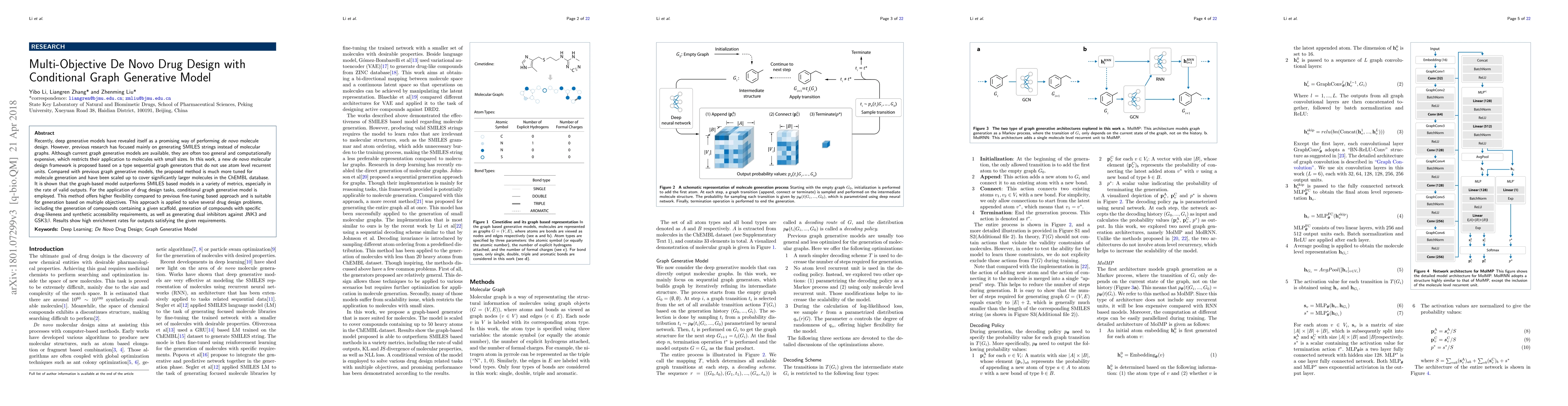 This paper proposes a new conditional graph generative model for multi-objective de novo drug design, which outperforms SMILES-based models in generating valid molecules. The method scales to larger molecules and offers higher flexibility for generating compounds with specific drug-likeness and synthetic accessibility.