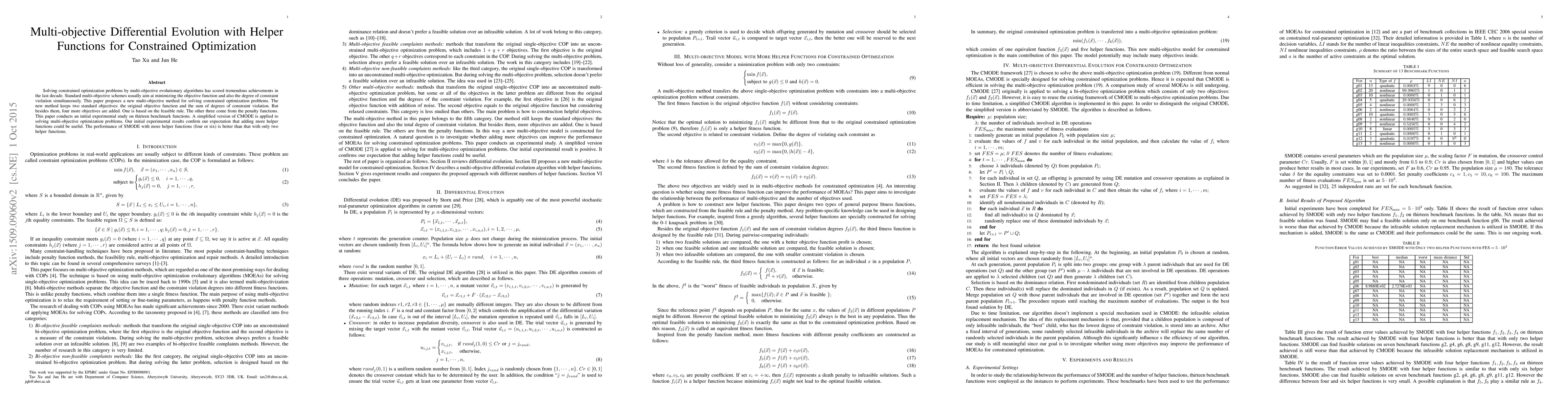 This paper introduces a new multi-objective differential evolution method for solving constrained optimization problems by incorporating additional helper functions. Initial experiments on benchmark functions show that including more helper functions, such as feasible rule and penalty-based objectives, improves performance compared to the standard approach.