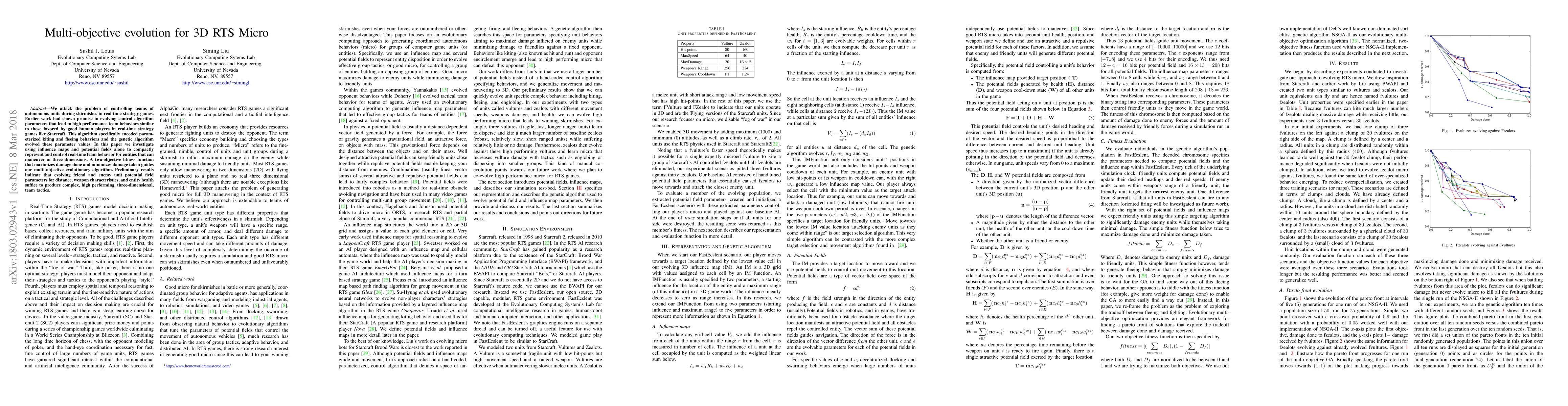 We attack the problem of controlling teams of autonomous units during skirmishes in real-time strategy games. Earlier work had shown promise in evolving control algorithm parameters that lead to high performance team behaviors similar to those favored by good human players in real-time strategy games like Starcraft. This algorithm specifically encoded parameterized kiting and fleeing behaviors and the genetic algorithm evolved these parameter values. In this paper we investigate using influence maps and potential fields alone to compactly represent and control real-time team behavior for entities that can maneuver in three dimensions. A two-objective fitness function that maximizes damage done and minimizes damage taken guides our multi-objective evolutionary algorithm. Preliminary results indicate that evolving friend and enemy unit potential field parameters for distance, weapon characteristics, and entity health suffice to produce complex, high performing, three-dimensional, team tactics.