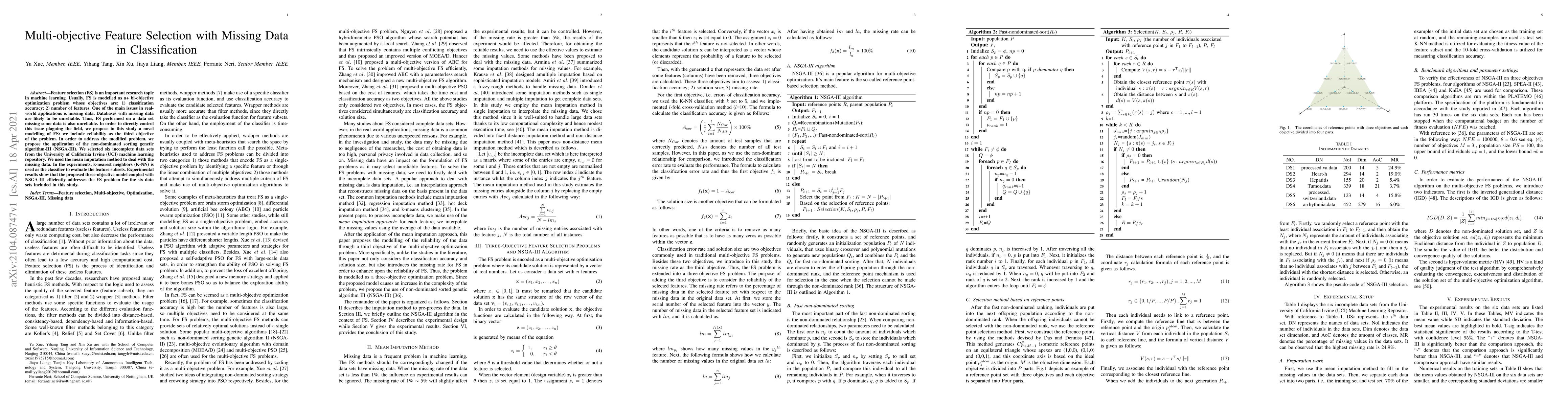 This study proposes a novel multi-objective feature selection method that incorporates reliability as a third objective to address missing data in classification datasets. The proposed model using the non-dominated sorting genetic algorithm-III (NSGA-III) efficiently solves the feature subset selection problem with missing data.