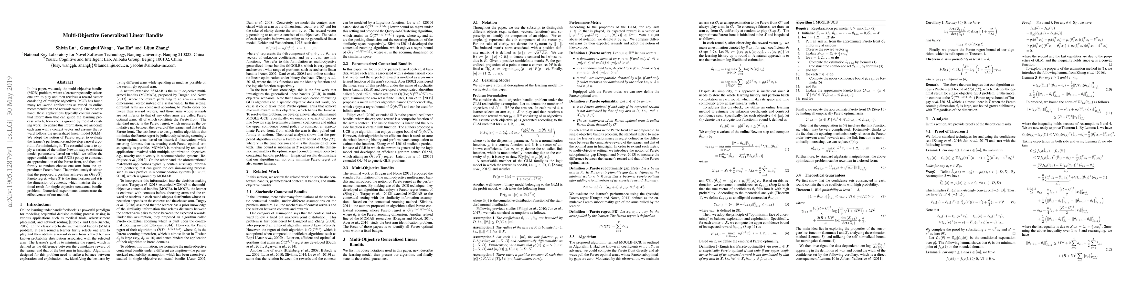 This paper proposes a novel algorithm for multi-objective generalized linear bandits that efficiently balances competing objectives while utilizing contextual information.