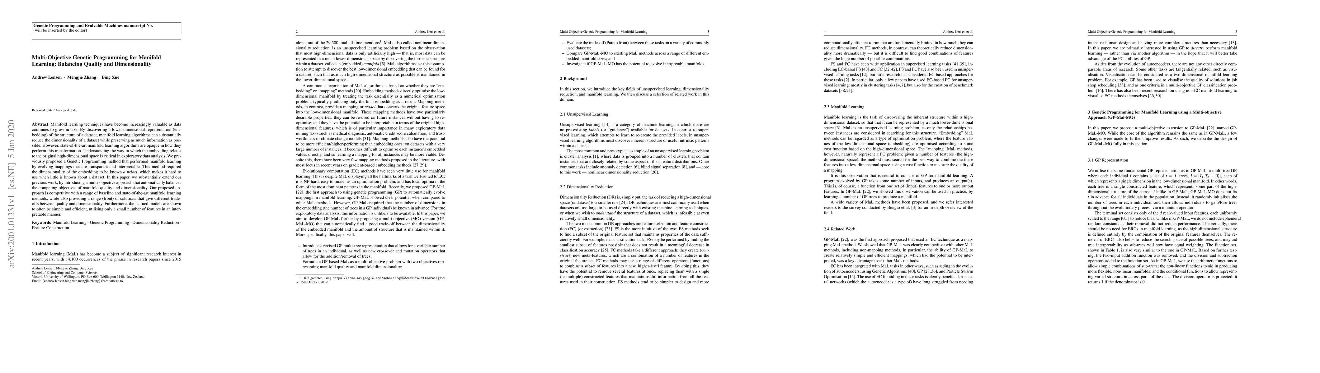 This paper introduces a multi-objective genetic programming approach for manifold learning that balances quality and dimensionality, outperforming traditional methods while offering interpretable solutions.