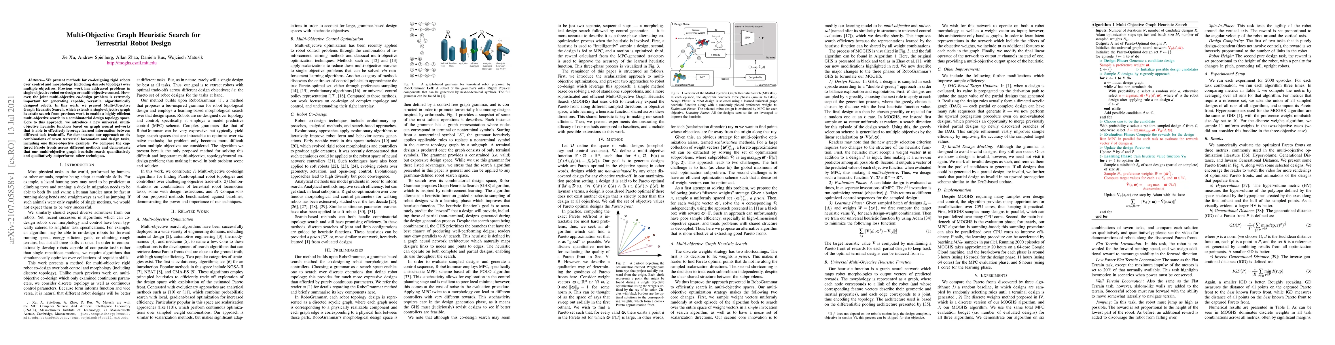 This paper introduces Multi-Objective Graph Heuristic Search for co-designing terrestrial robots by optimizing both control and morphology across multiple objectives. The method employs a universal heuristic function based on graph neural networks to efficiently navigate the design space, outperforming other techniques in generating versatile robots.