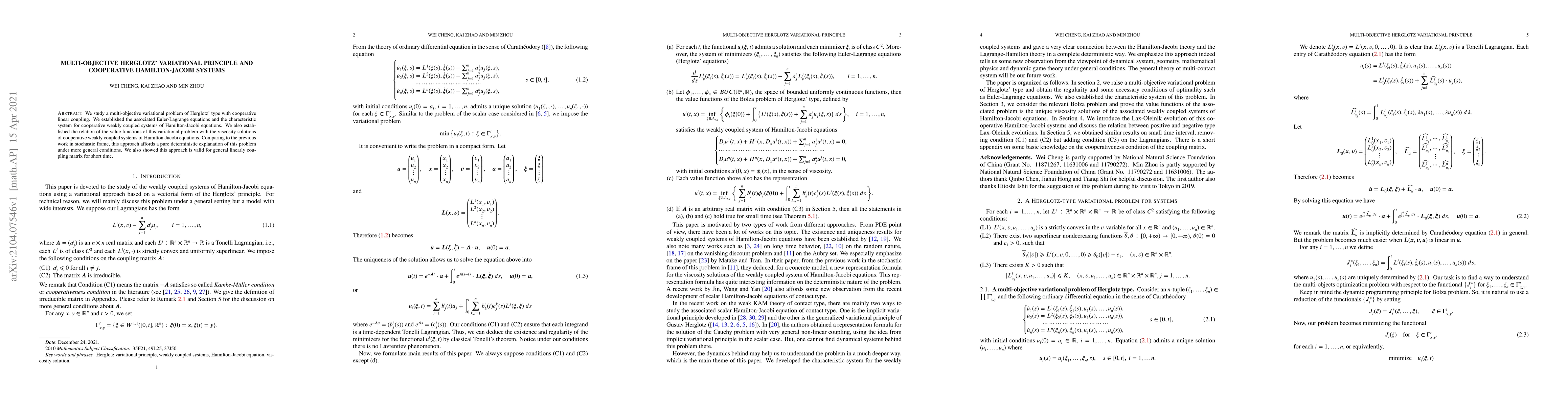 We study a multi-objective variational problem of Herglotz' type with cooperative linear coupling. We established the associated Euler-Lagrange equations and the characteristic system for cooperative weakly coupled systems of Hamilton-Jacobi equations. We also established the relation of the value functions of this variational problem with the viscosity solutions of cooperative weakly coupled systems of Hamilton-Jacobi equations. Comparing to the previous work in stochastic frame, this approach affords a pure deterministic explanation of this problem under more general conditions. We also showed this approach is valid for general linearly coupling matrix for short time.