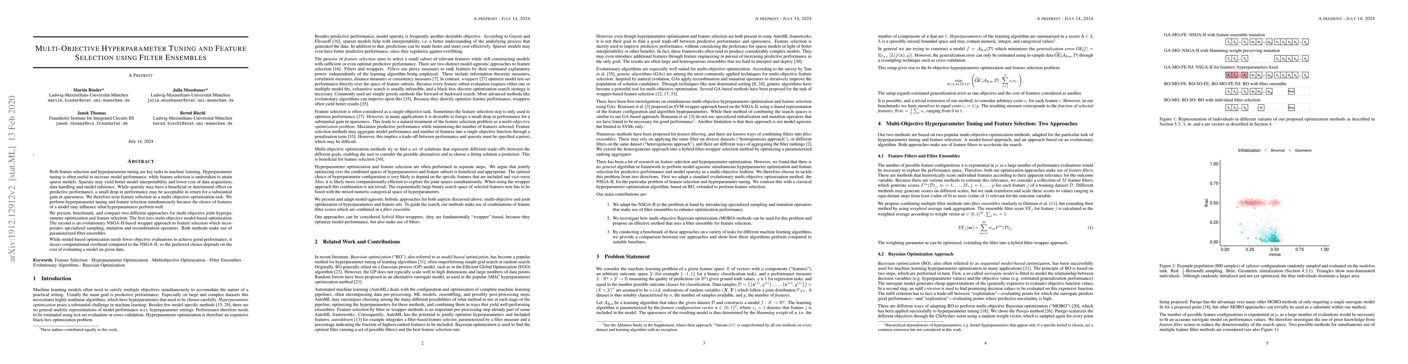 The paper presents a method for simultaneous hyperparameter tuning and feature selection using filter ensembles, comparing two approaches: multi-objective model-based optimization and an NSGA-II-based wrapper approach. Both methods utilize parameterized filter ensembles.