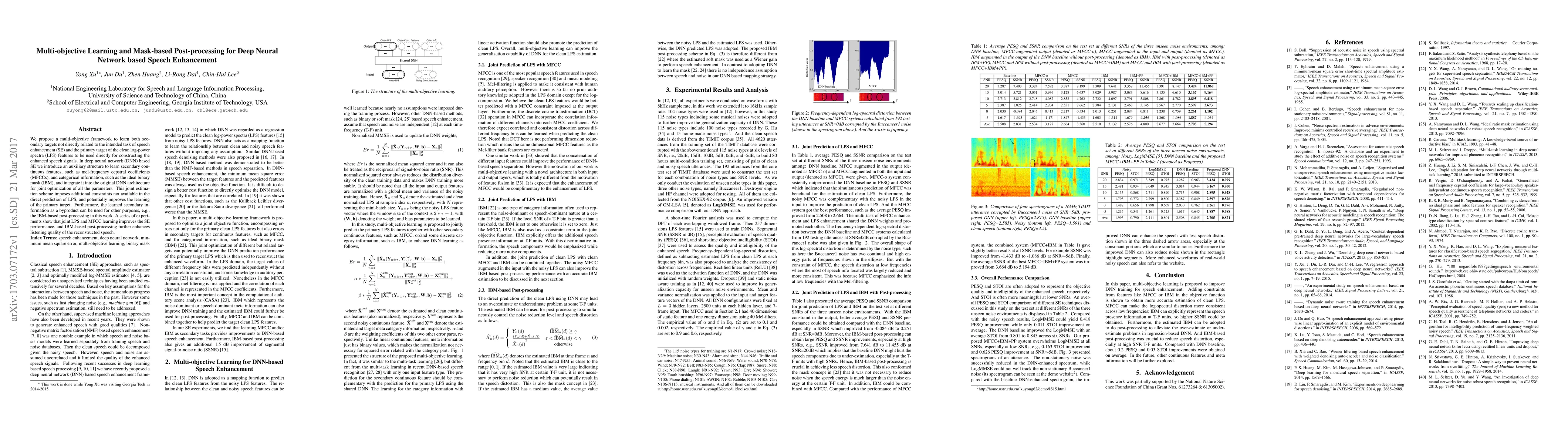 This paper proposes a multi-objective learning framework for deep neural networks to enhance speech by optimizing both clean log-power spectra features and secondary targets like MFCCs and ideal binary masks. The integration of these objectives improves speech enhancement performance and post-processing further boosts listening quality.