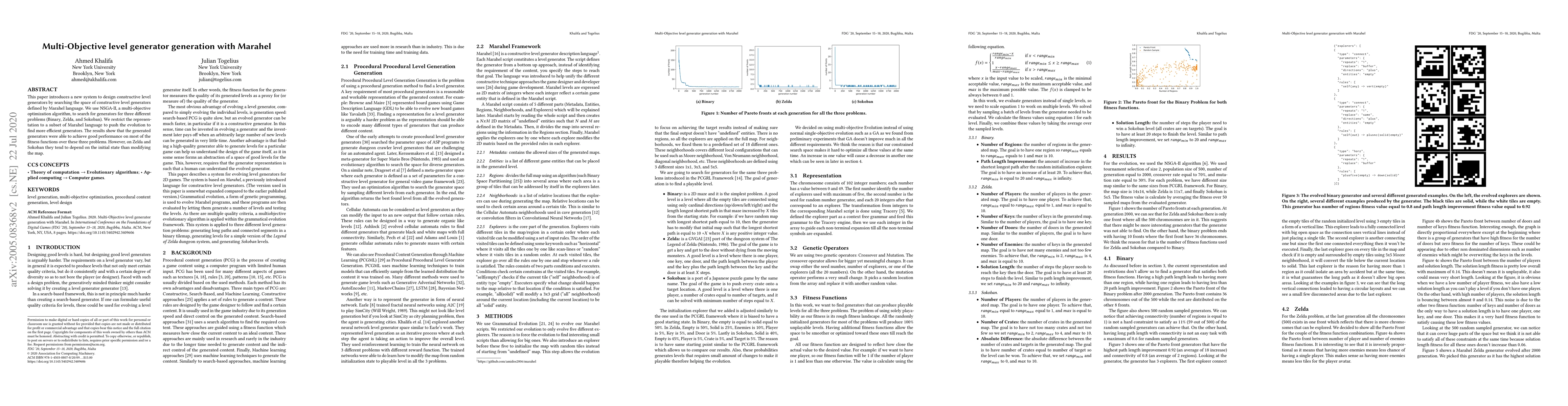This paper presents a system using NSGA-II for multi-objective optimization to generate constructive level designs in the Marahel language, achieving good performance across Binary, Zelda, and Sokoban problems, though Zelda and Sokoban levels show initial state dependency.