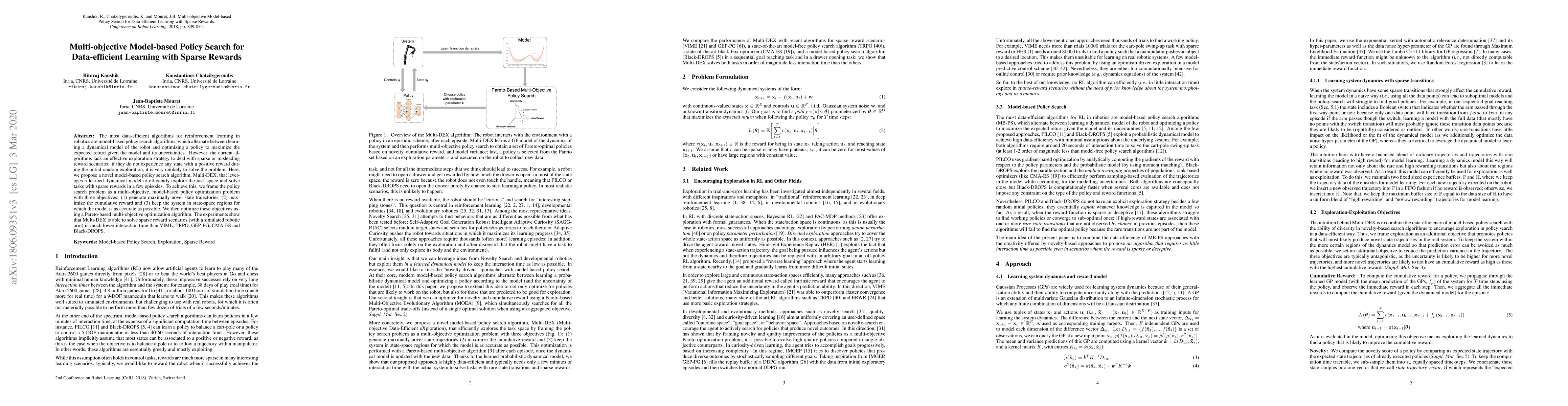 This paper introduces Multi-DEX, a novel multi-objective model-based policy search algorithm for data-efficient reinforcement learning in robotics, which efficiently explores sparse reward environments by optimizing three objectives: novelty of state trajectories, expected return, and model accuracy. Experiments demonstrate that Multi-DEX outperforms existing methods in solving sparse reward tasks with fewer interactions.