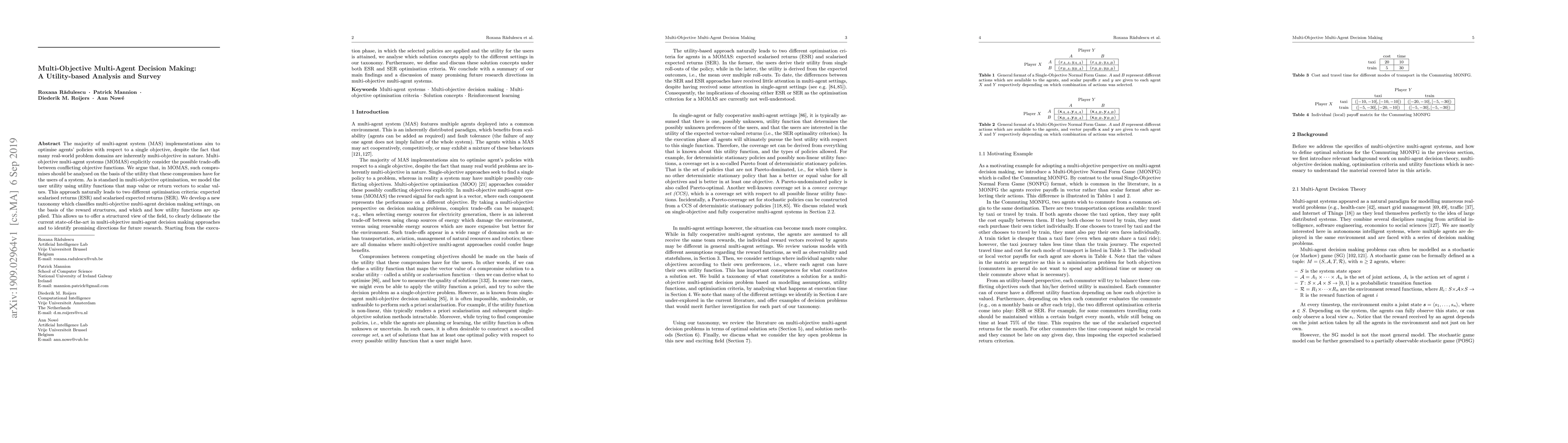 This paper surveys multi-objective multi-agent decision making, emphasizing utility-based analysis to handle conflicting objectives. It proposes a taxonomy to classify various decision-making settings based on reward structures and utility function applications, outlining current approaches and future research directions.