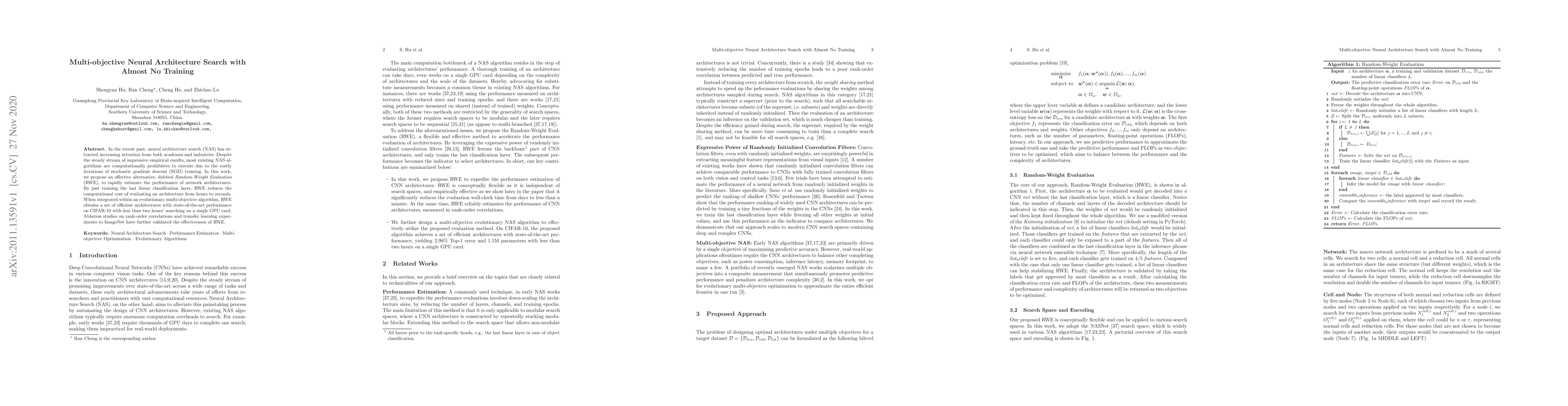 In the recent past, neural architecture search (NAS) has attracted increasing attention from both academia and industries. Despite the steady stream of impressive empirical results, most existing NAS algorithms are computationally prohibitive to execute due to the costly iterations of stochastic gradient descent (SGD) training. In this work, we propose an effective alternative, dubbed Random-Weight Evaluation (RWE), to rapidly estimate the performance of network architectures. By just training the last linear classification layer, RWE reduces the computational cost of evaluating an architecture from hours to seconds. When integrated within an evolutionary multi-objective algorithm, RWE obtains a set of efficient architectures with state-of-the-art performance on CIFAR-10 with less than two hours' searching on a single GPU card. Ablation studies on rank-order correlations and transfer learning experiments to ImageNet have further validated the effectiveness of RWE.