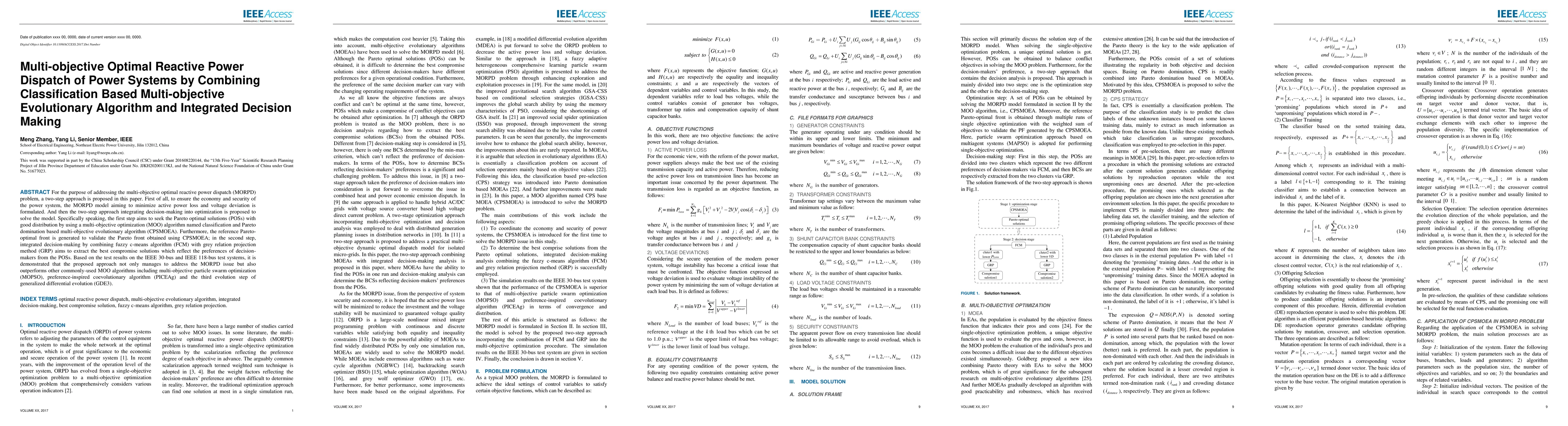This paper proposes a two-step approach for multi-objective optimal reactive power dispatch (MORPD) combining a classification-based multi-objective evolutionary algorithm (CPSMOEA) and integrated decision-making using fuzzy c-means and grey relation projection. The method outperforms other algorithms in minimizing active power loss and voltage deviation.