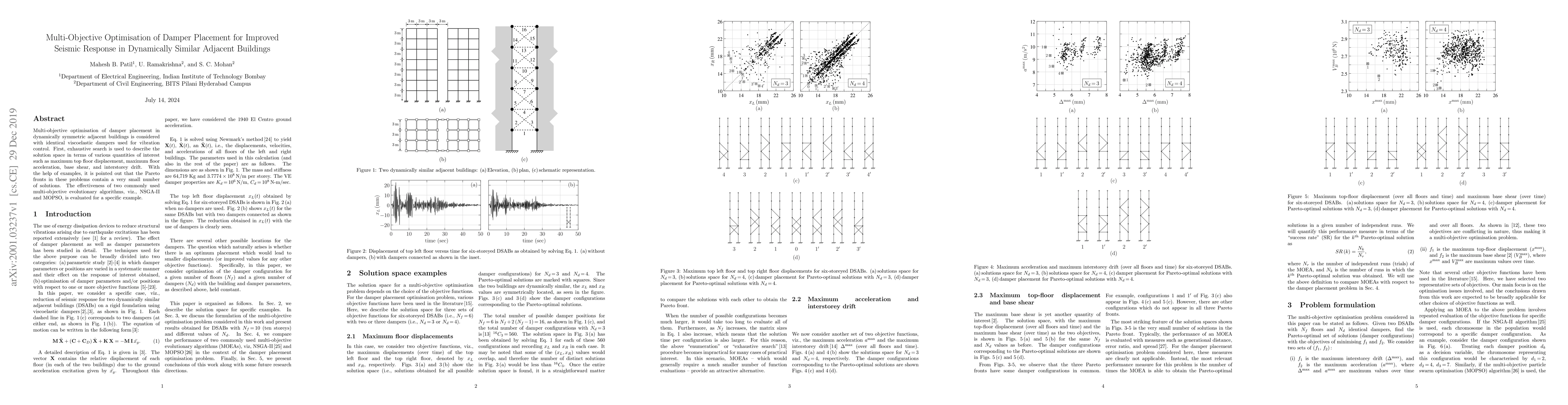 This paper explores multi-objective optimization for damper placement in dynamically similar adjacent buildings to enhance seismic response. It uses exhaustive search and evolutionary algorithms like NSGA-II and MOPSO to identify optimal damper configurations minimizing top floor displacement, floor acceleration, base shear, and interstorey drift.