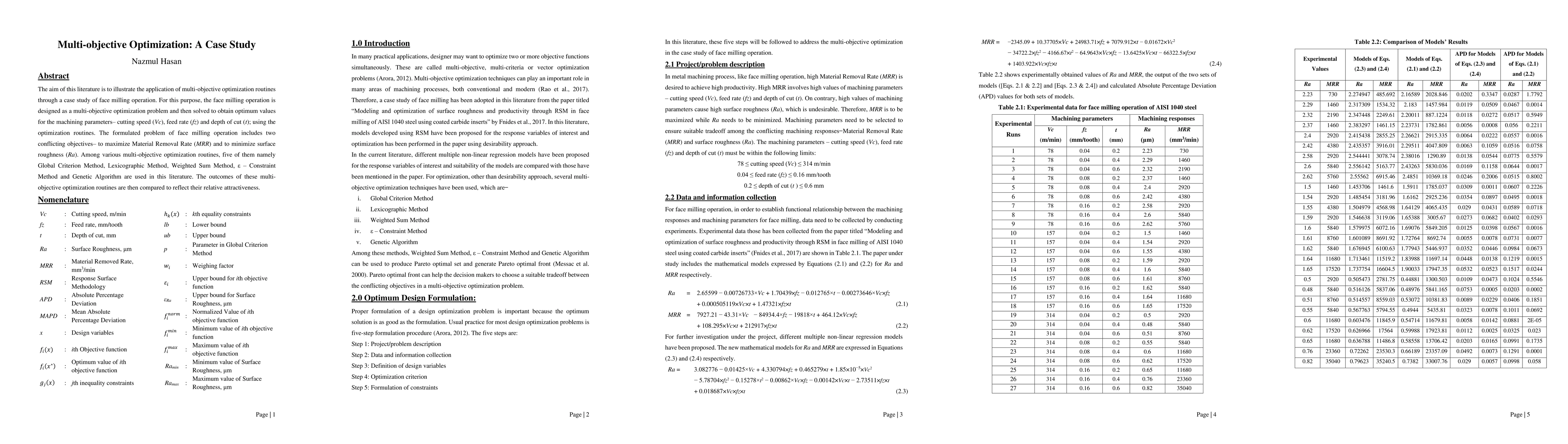 This paper applies multi-objective optimization techniques to a face milling operation, aiming to maximize Material Removal Rate while minimizing surface roughness. Five optimization methods are evaluated to determine the best approach for optimizing cutting speed, feed rate, and depth of cut.